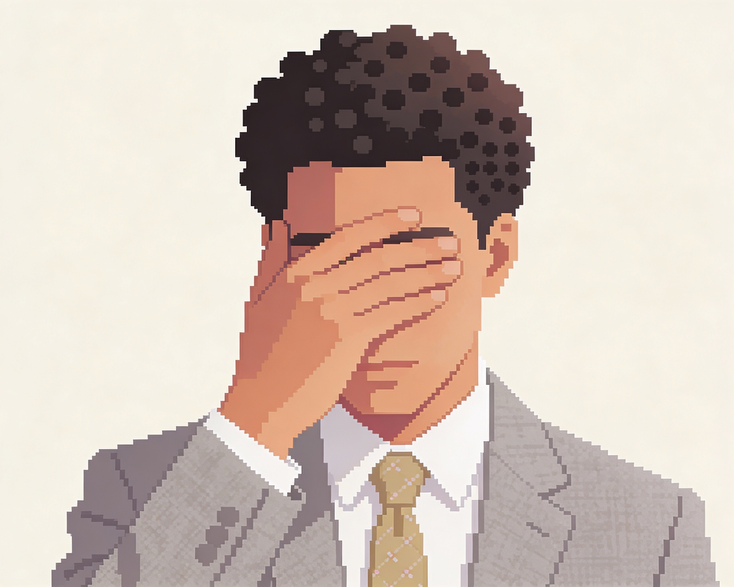 Pixel art of a man in a suit covering his face with one hand, set against a plain background, showcasing a retro digital aesthetic.