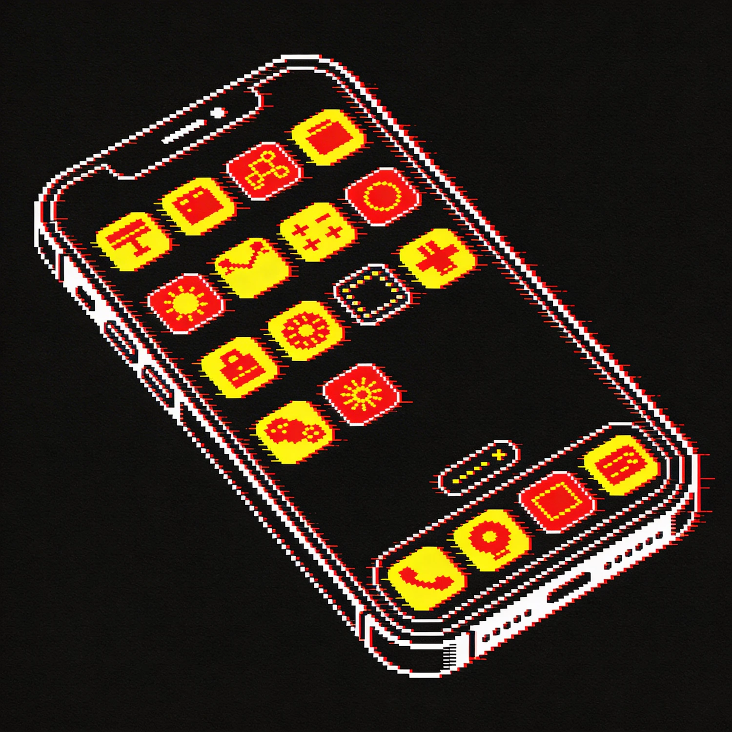 Pixel art of a smartphone with red and yellow app icons on a black background, showcasing a retro digital aesthetic.