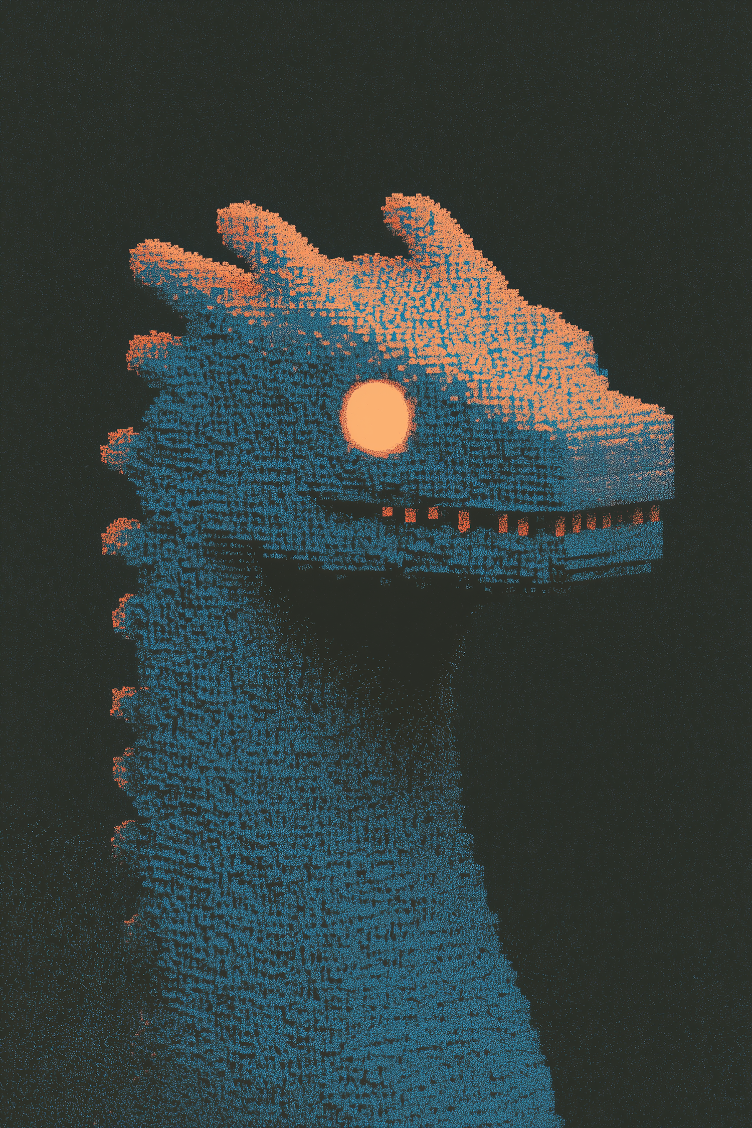 Pixelated dragon-like creature with glowing orange eye and textured blue body on a dark background.