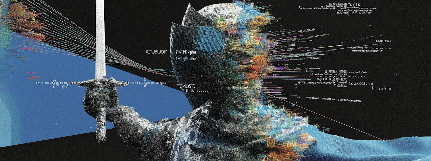A knight dissolves into vibrant pixelated fragments and data streams, holding a sword in a surreal digital artwork.