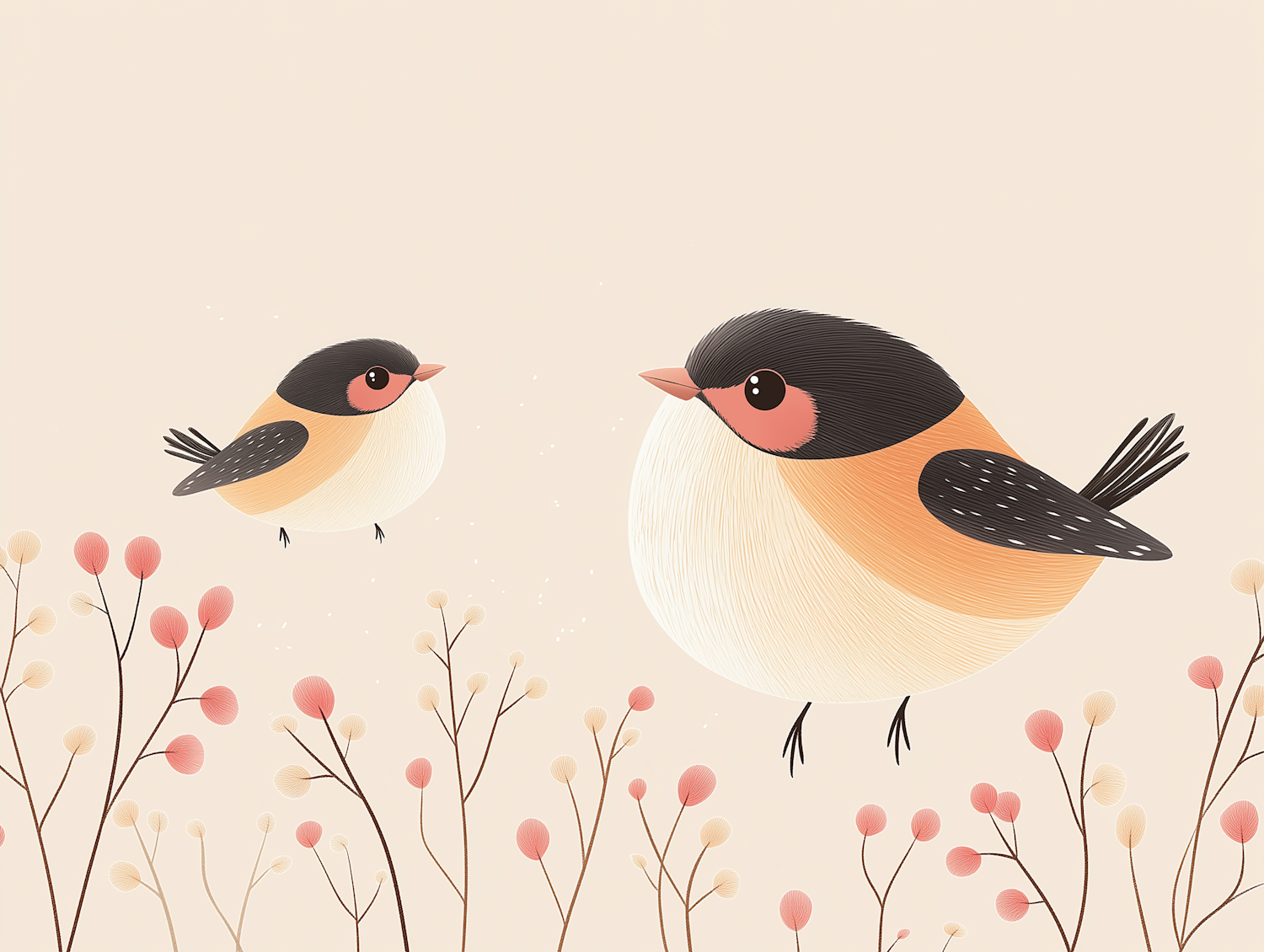 Illustration of adorable round birds with pastel floral branches, evoking a light and charming aesthetic.