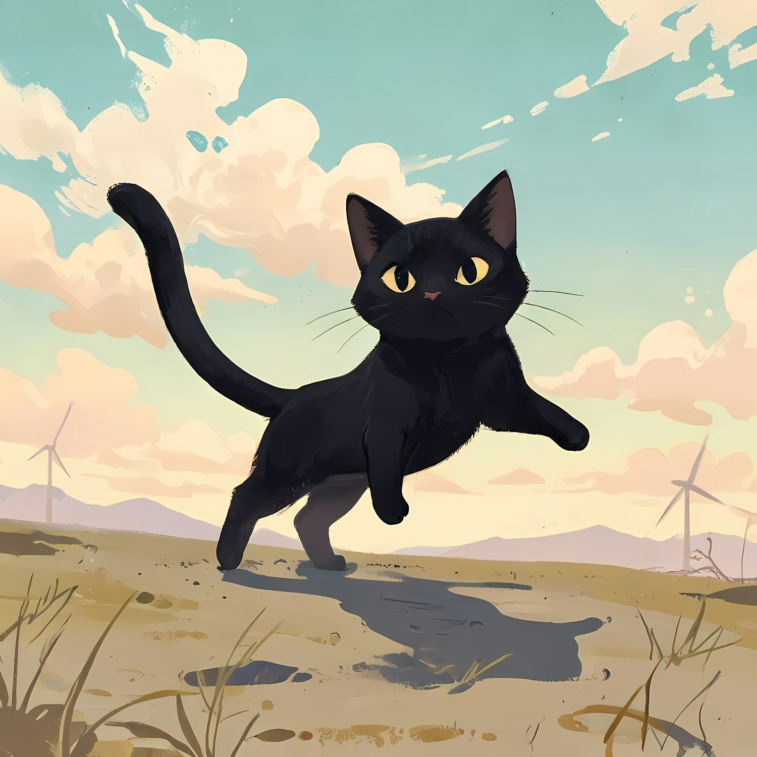 Playful black cat with yellow eyes in a serene field, pastel skies, and wind turbines in the distance. Whimsical and adventurous vibe.