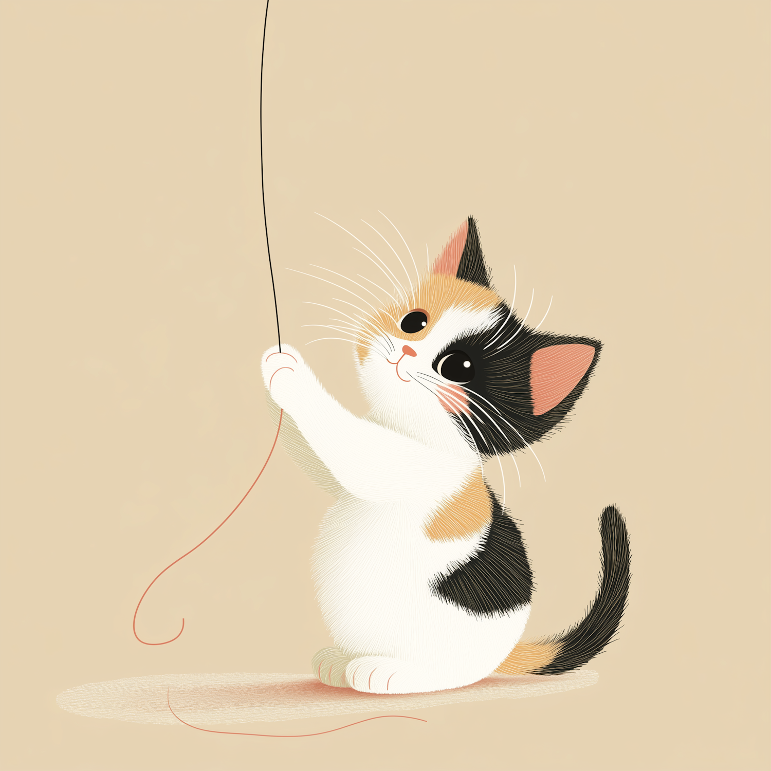 Adorable calico kitten illustration with big eyes, playing with a string on a soft beige background. Perfect for cat lovers!