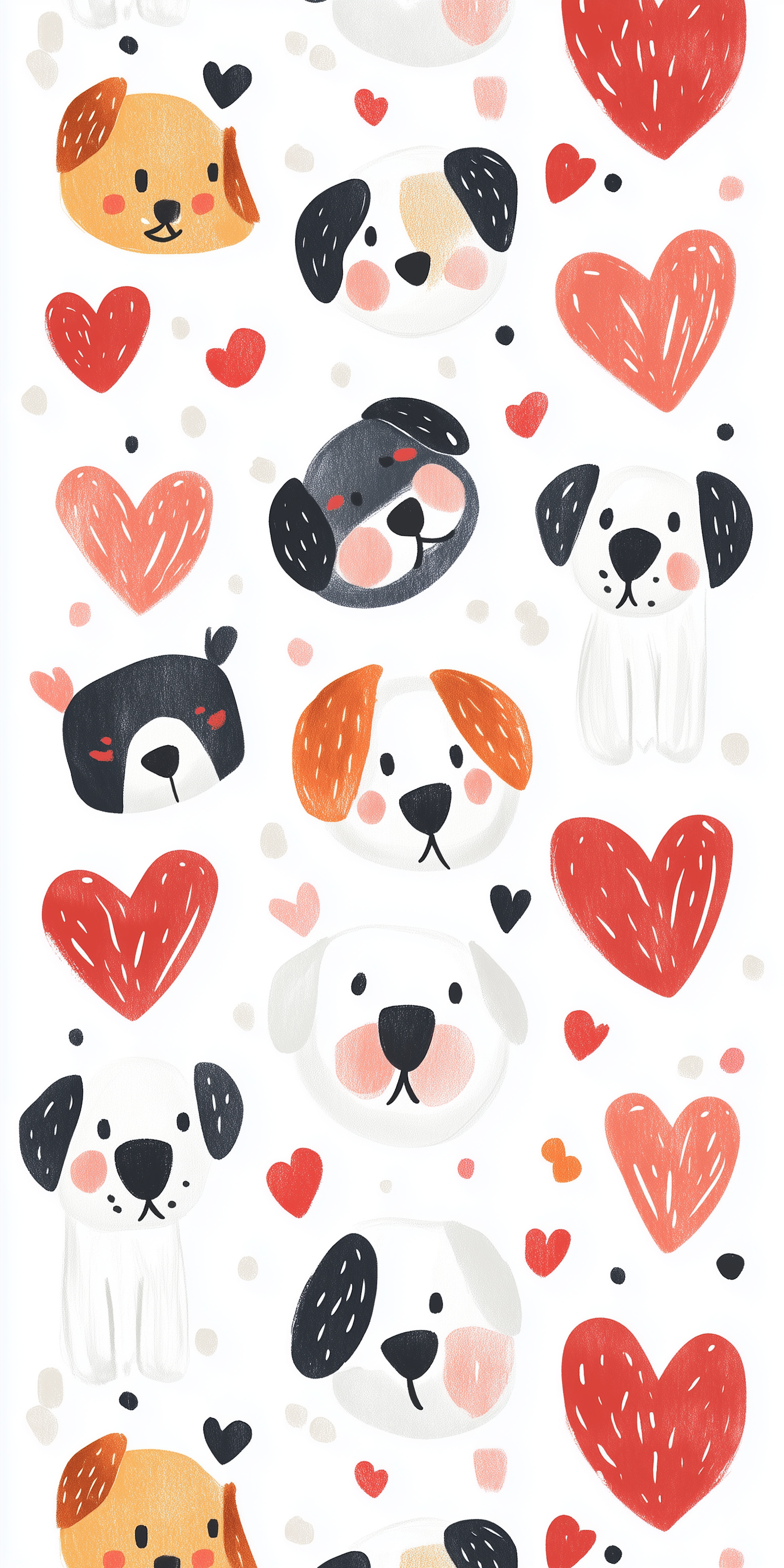 Cute cartoon dog faces and hearts in a playful, colorful pattern. Perfect for dog lovers and whimsical design enthusiasts.