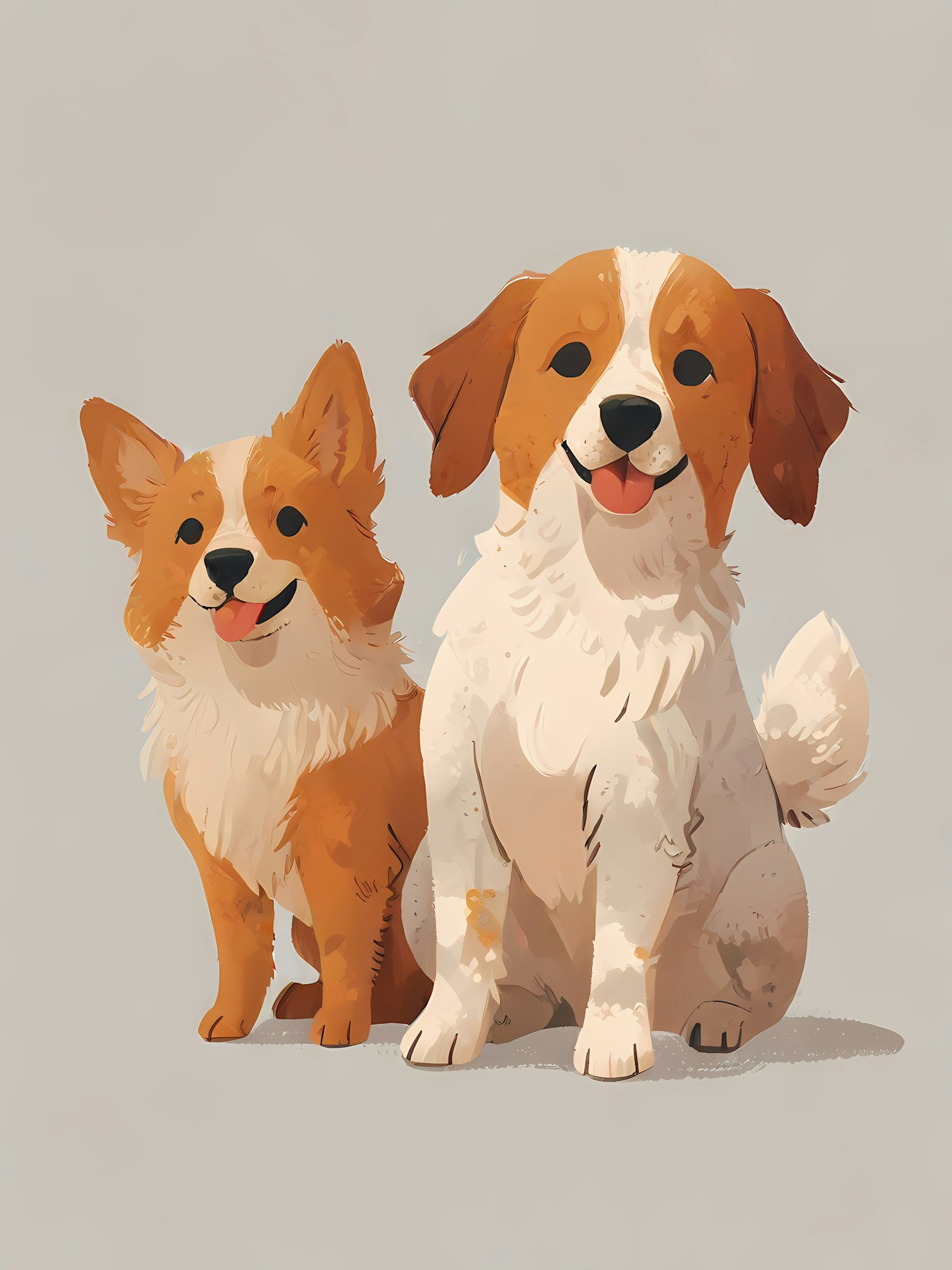 Charming illustration of two cartoon dogs with fluffy coats and happy expressions, set against a light gray background.