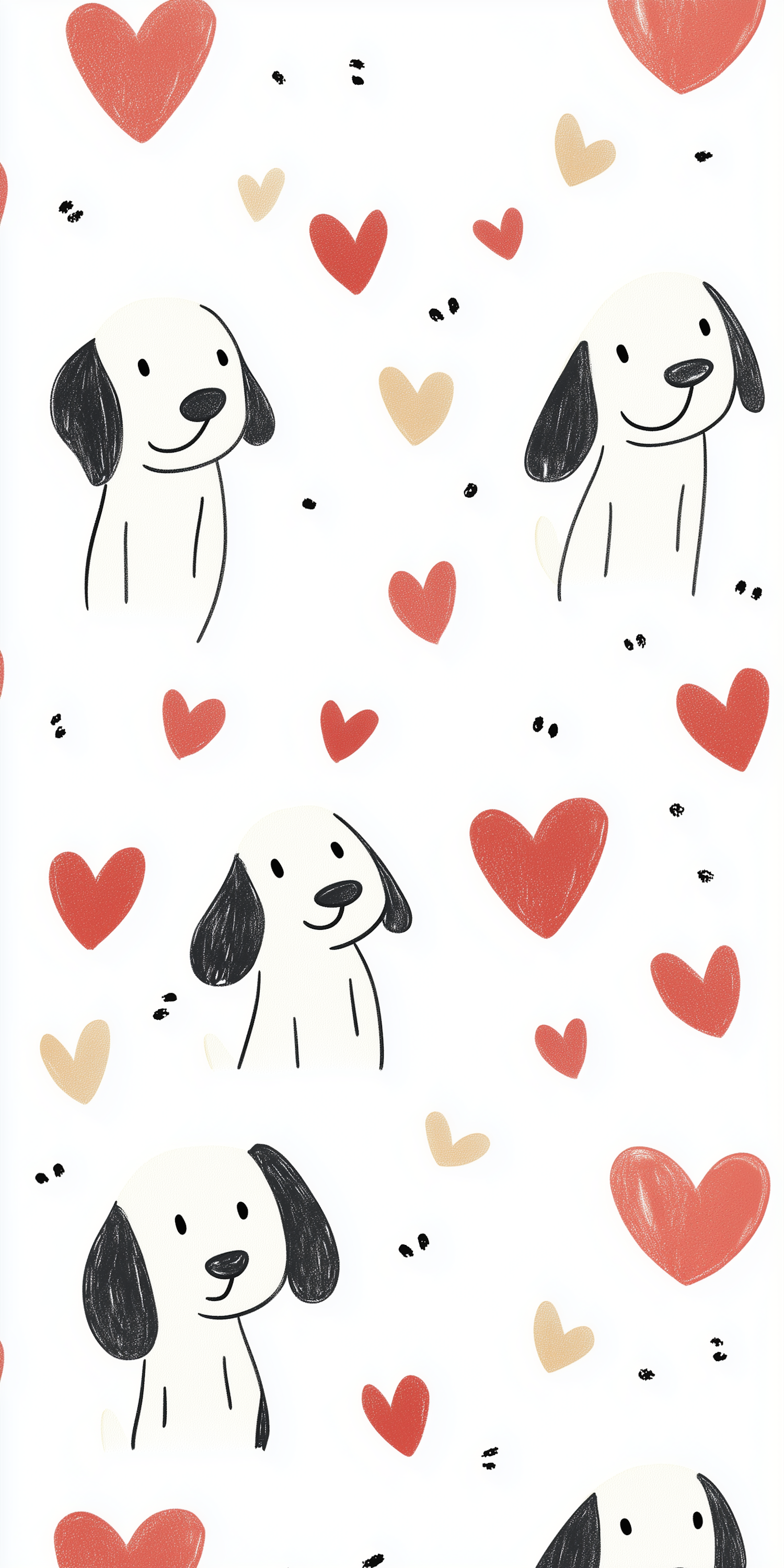 Cute cartoon dogs with hearts in a playful pattern. Whimsical and charming illustration with red and beige hearts on a white background.