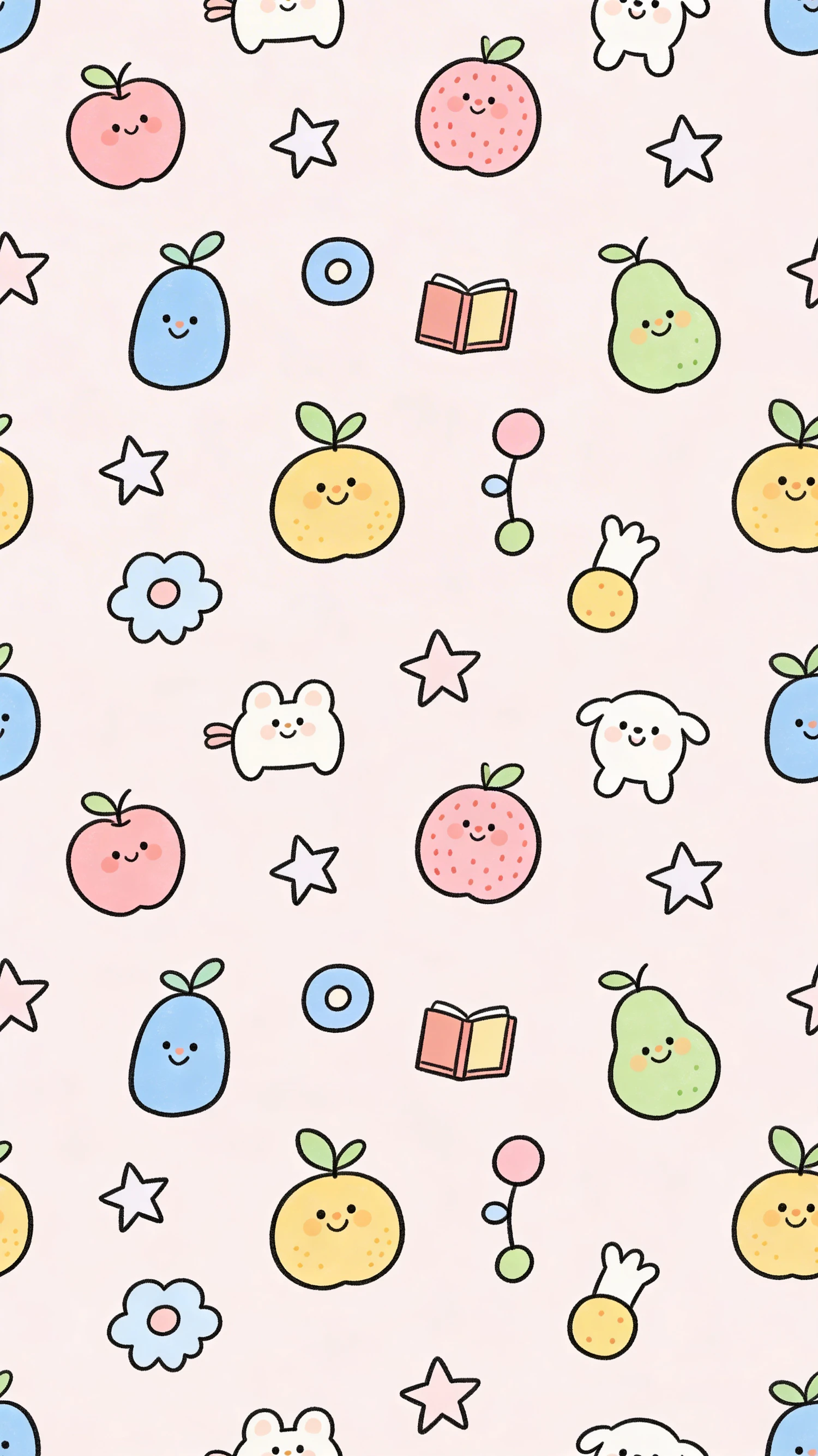 A seamless pattern of cute cartoon fruits, animals, and objects on a pastel pink background, perfect for cheerful designs.