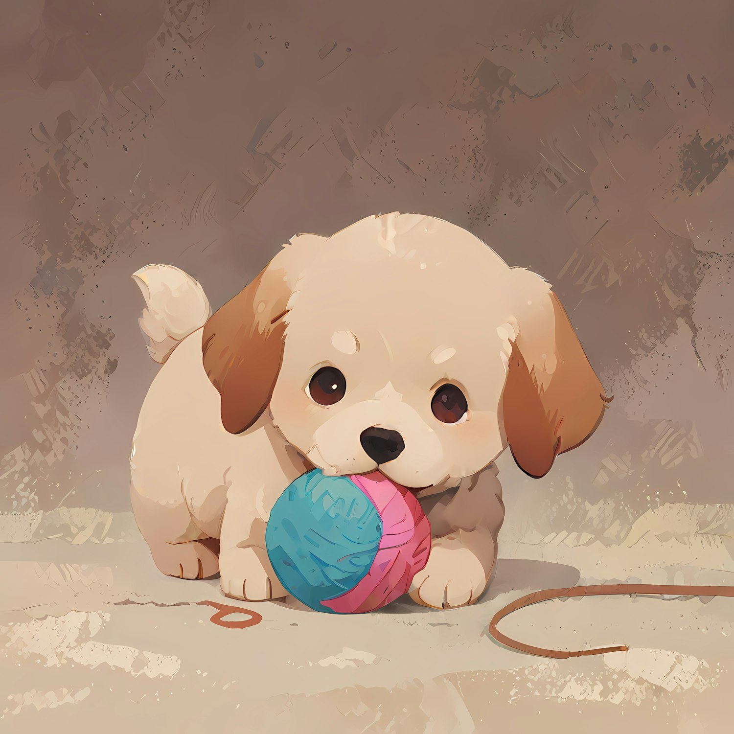 Adorable cartoon puppy with fluffy fur playing with a colorful ball of yarn on a textured brown background.