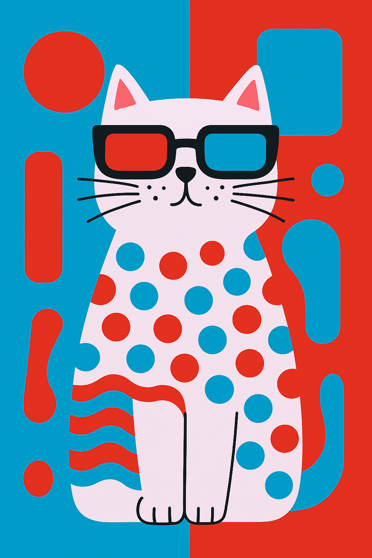 Quirky illustration of a polka-dotted cat wearing glasses, set against a bold red and blue abstract background.