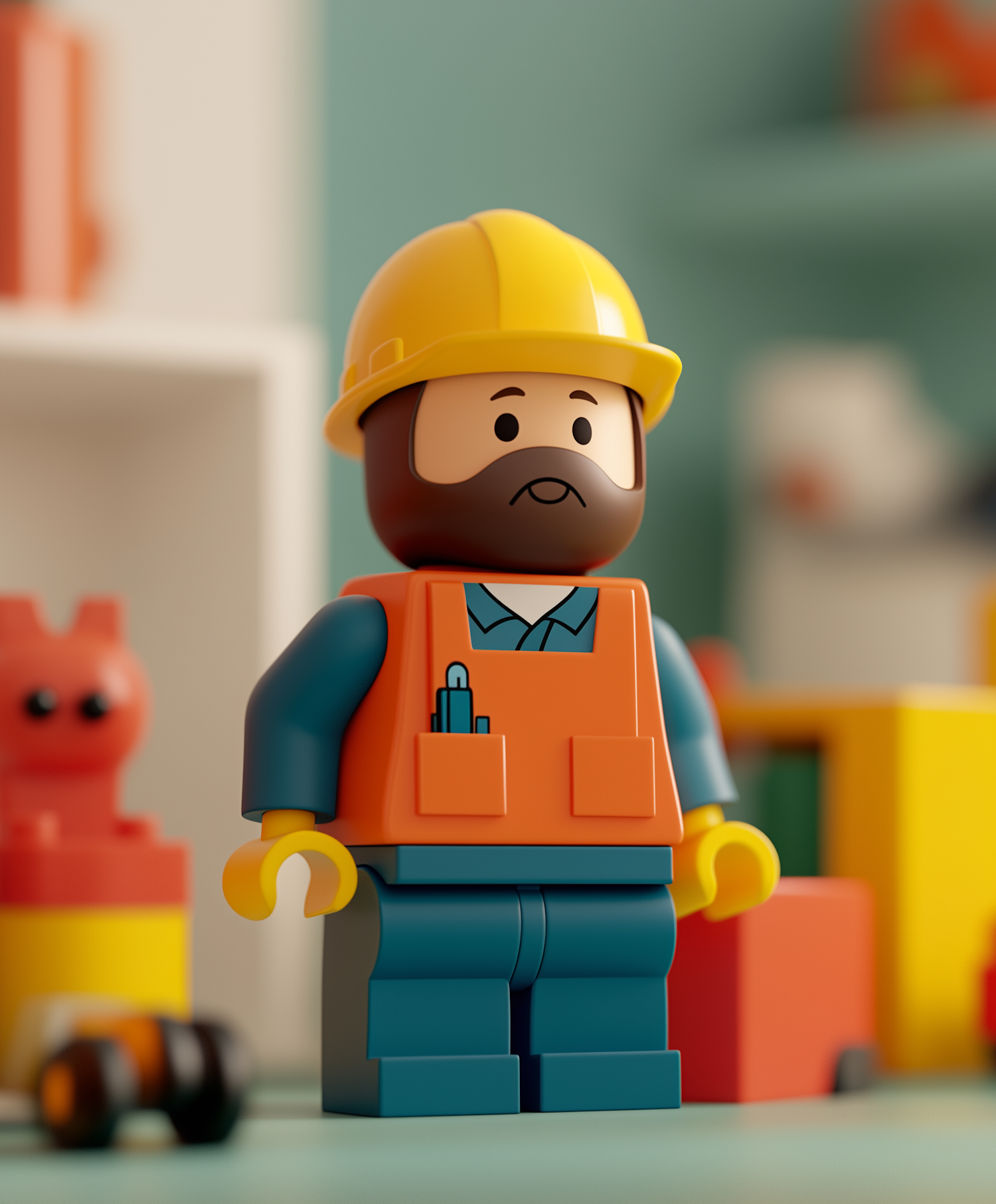 LEGO-style figure with yellow helmet and orange vest in a colorful, toy-like setting. Vibrant primary colors enhance the playful theme.