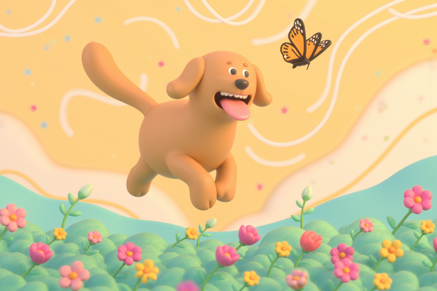 A playful cartoon dog leaps joyfully in a colorful meadow, chasing a butterfly under a whimsical yellow sky. Pure happiness!