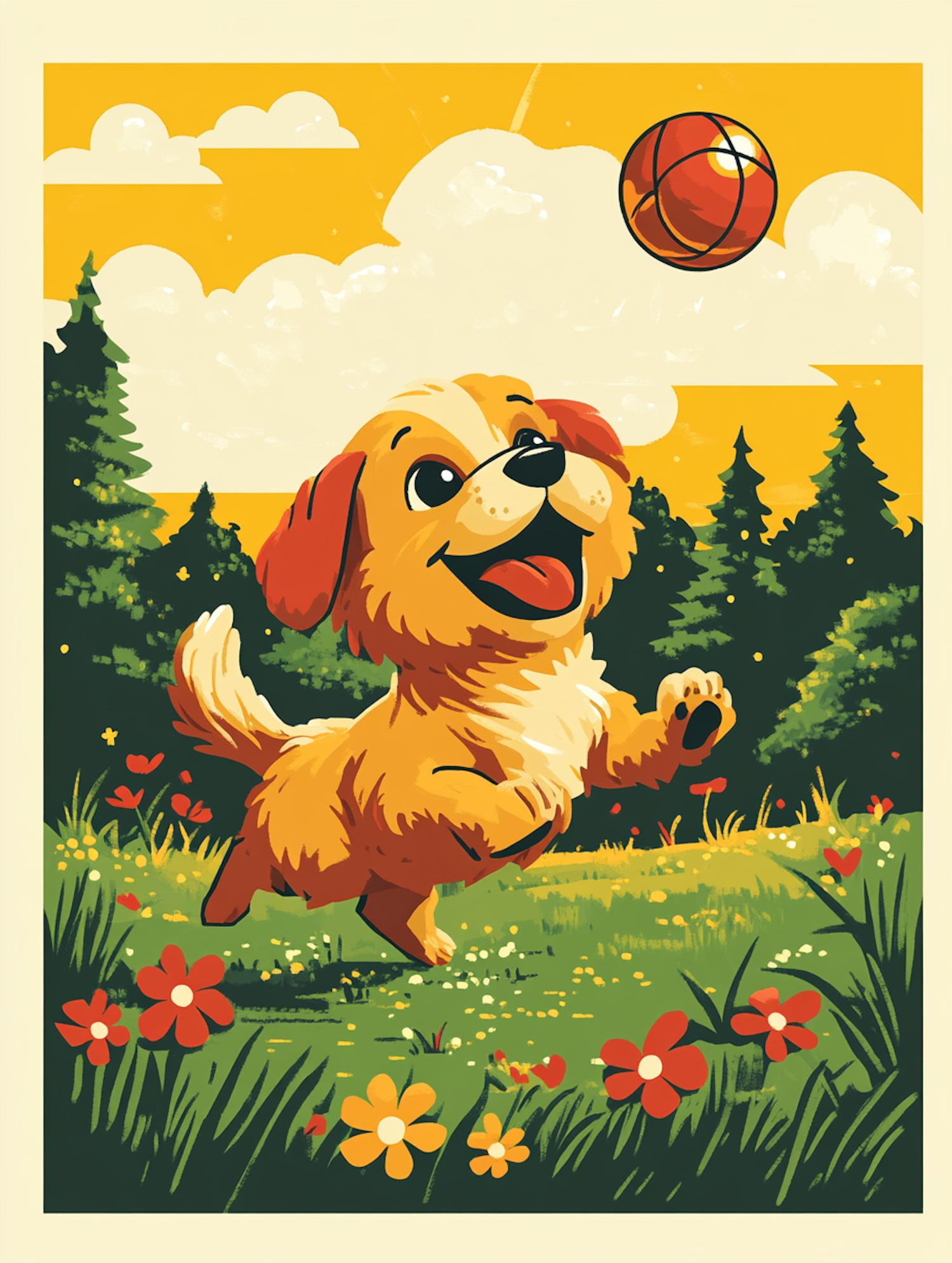 Cheerful cartoon dog chasing a red ball in a vibrant meadow with colorful flowers and a sunny sky.