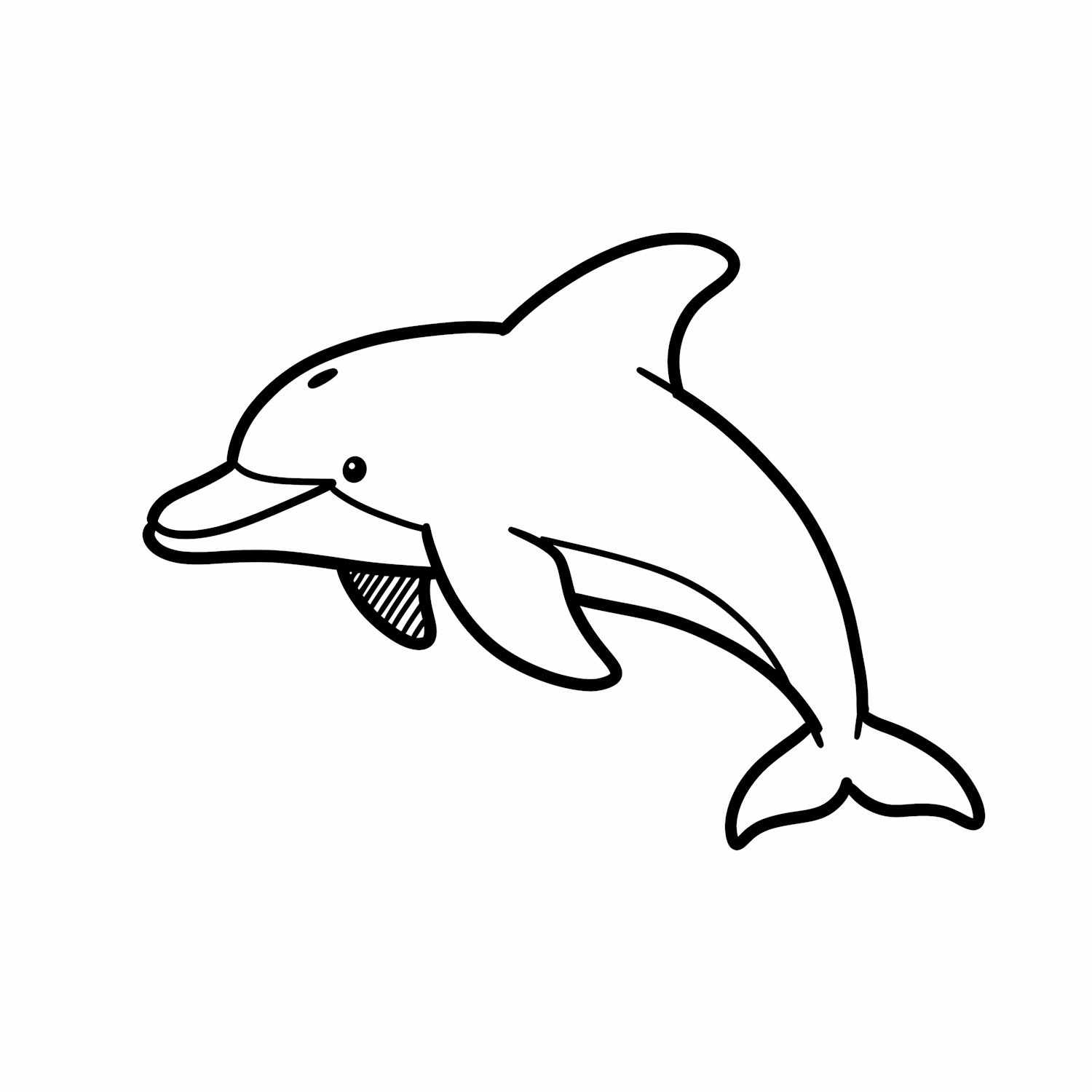 Minimalistic black-and-white line drawing of a dolphin in a playful pose, perfect for coloring or educational purposes.
