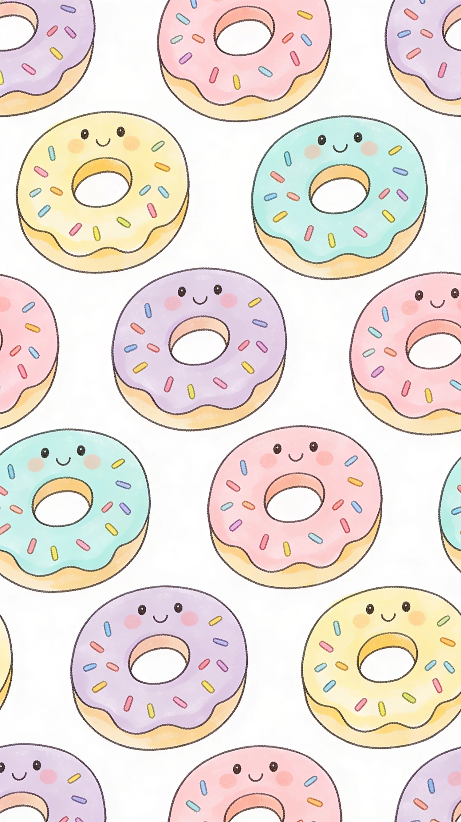 Repeating pattern Happy donuts with sprinkles, pastel icing, cute expressions.