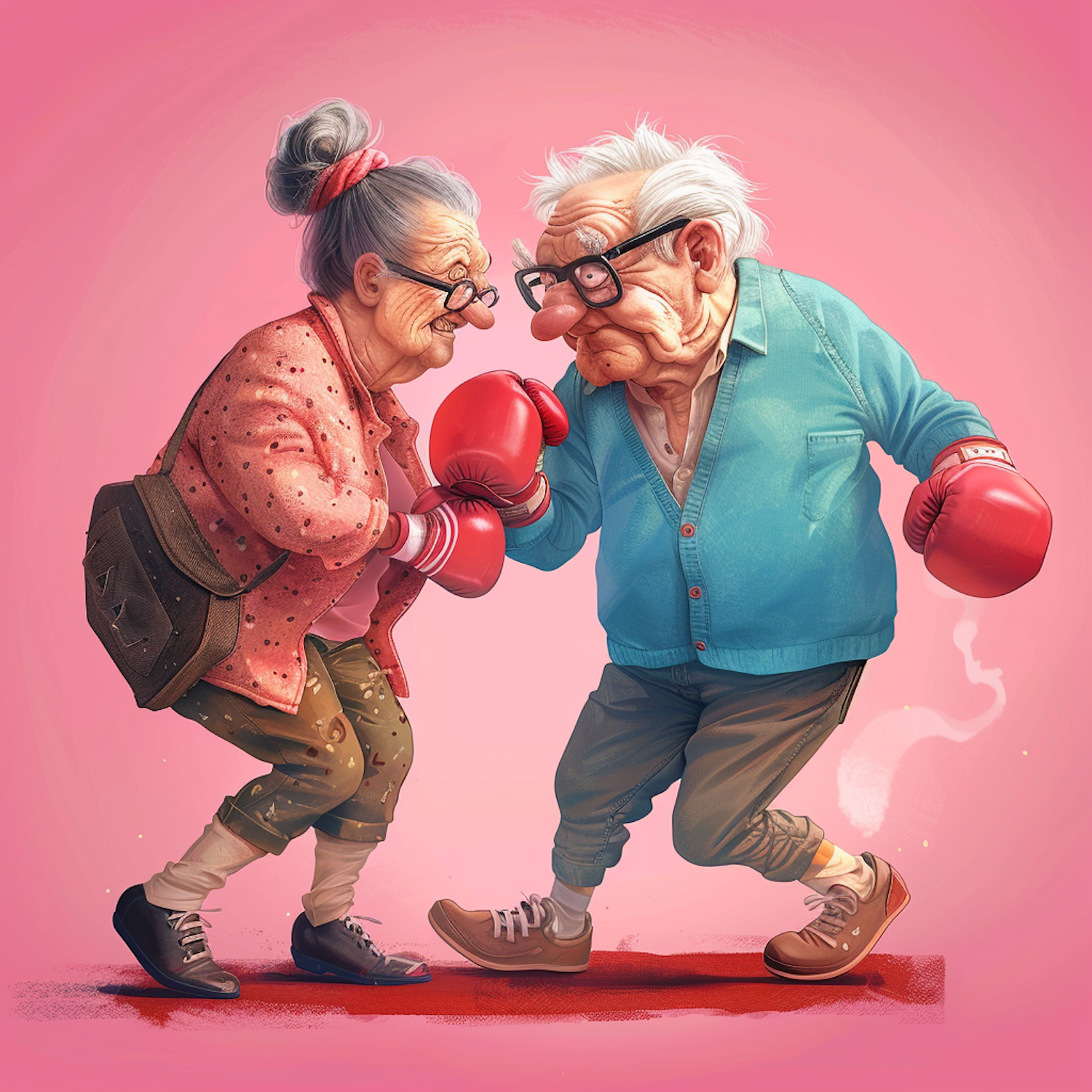 Elderly couple playfully boxing with red gloves, set against a pink background. Whimsical and humorous illustration.