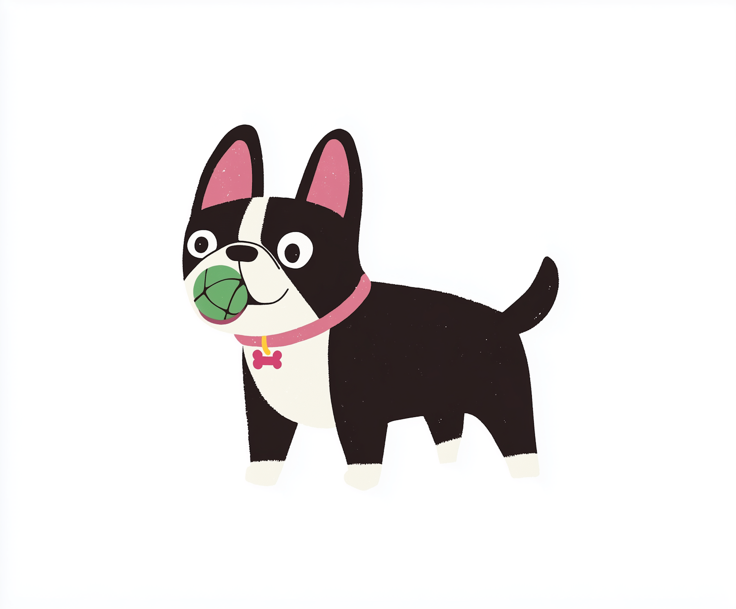 Cute cartoon French Bulldog with a green ball in its mouth, wearing a pink collar. Playful and charming illustration.
