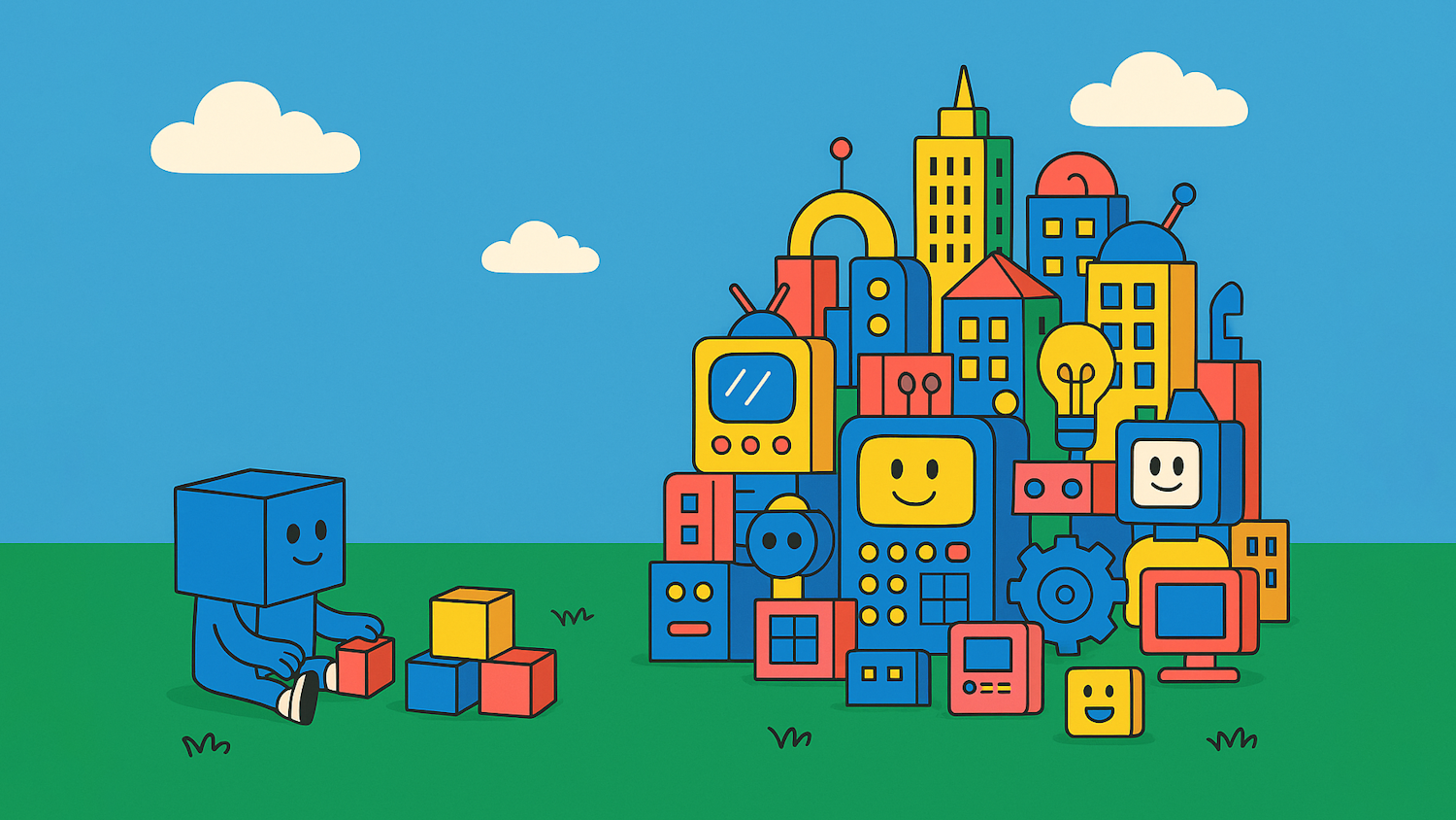 Whimsical illustration of a cube-headed figure building with blocks beside a colorful, cartoonish cityscape under a bright blue sky.