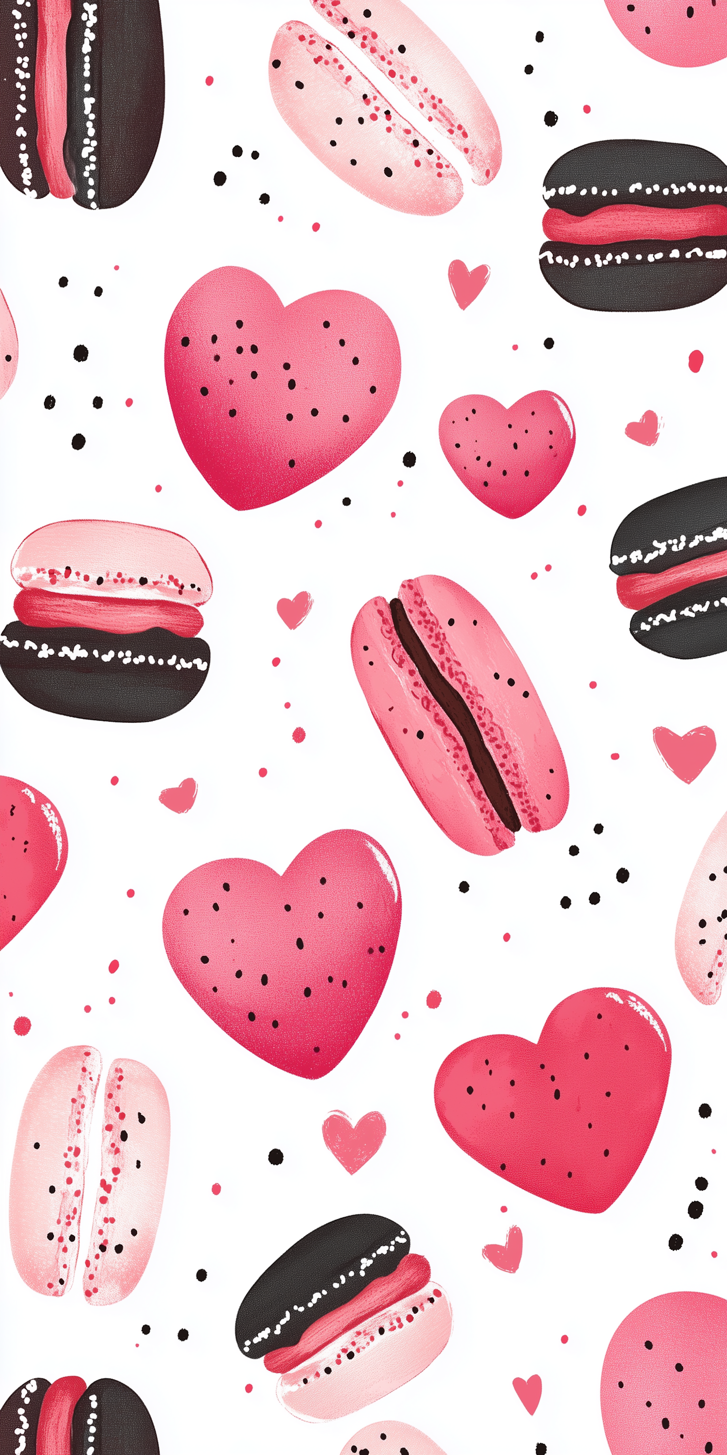 Colorful pattern of pink and black macarons with heart shapes on a white background, creating a playful and whimsical design.