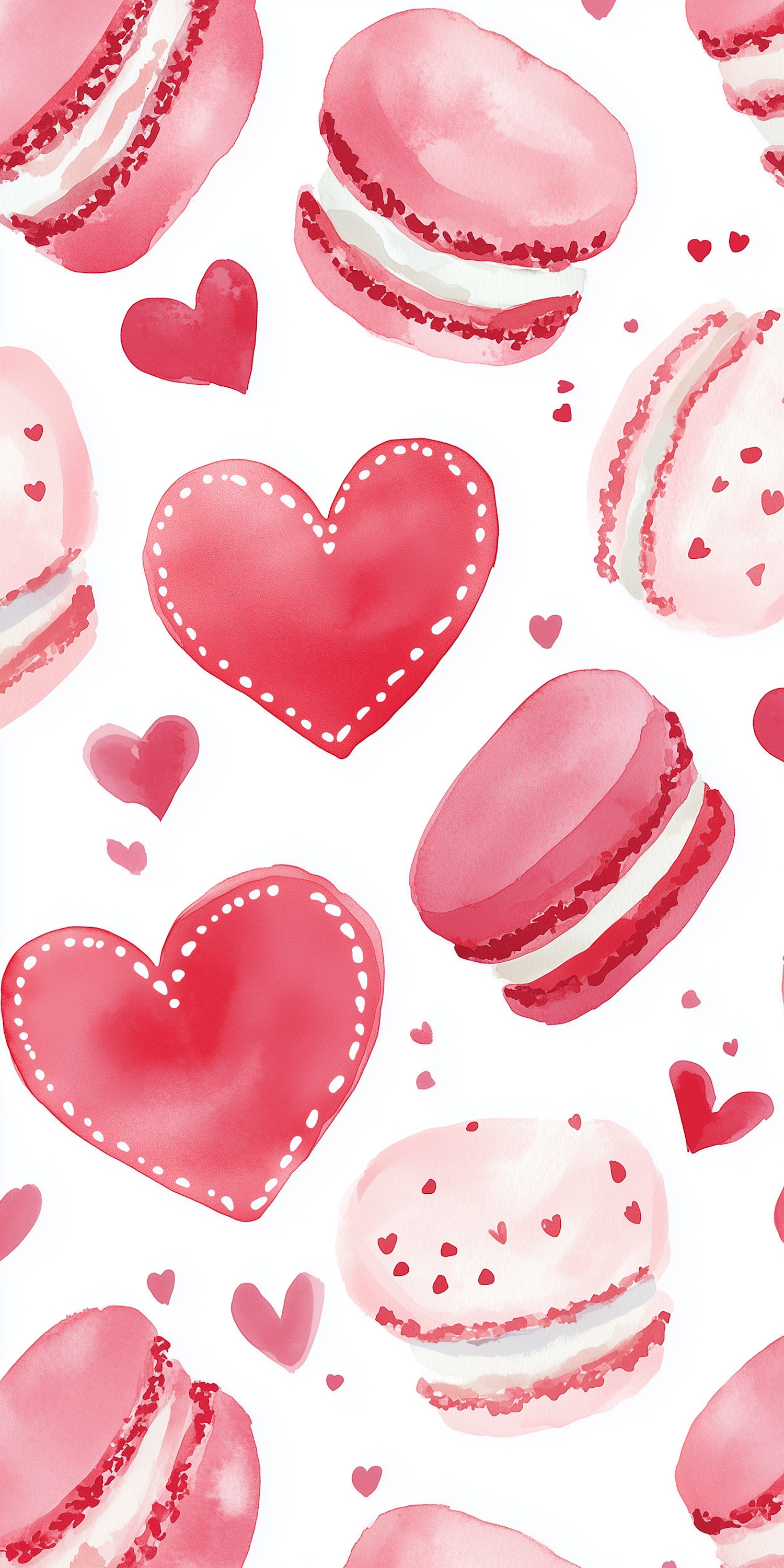 Charming watercolor pattern of pink macarons and hearts on a white background, perfect for a romantic or Valentine's Day theme.