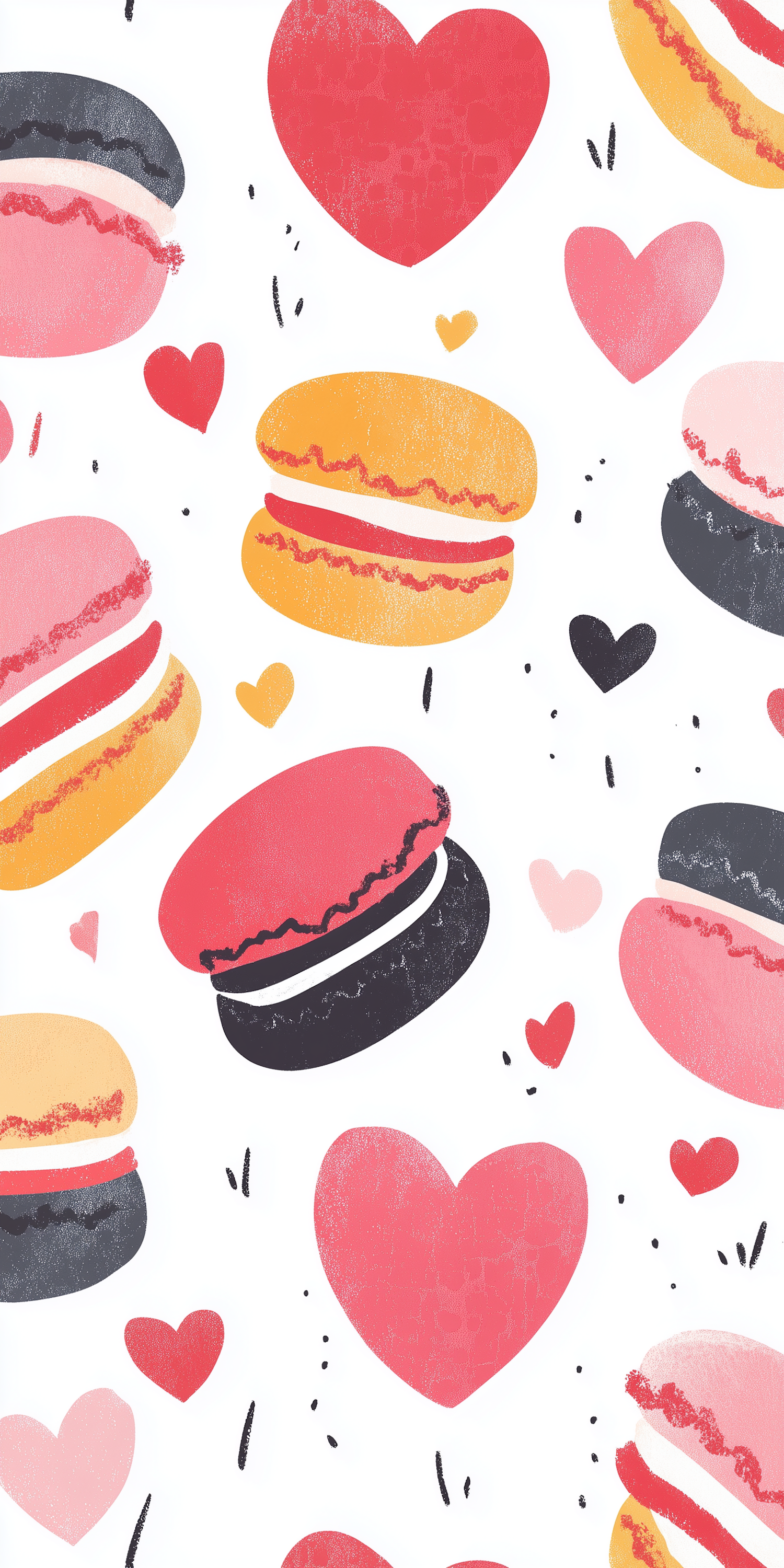 Colorful illustration of macarons and hearts on a white background, featuring pink, yellow, and black hues in a playful pattern.