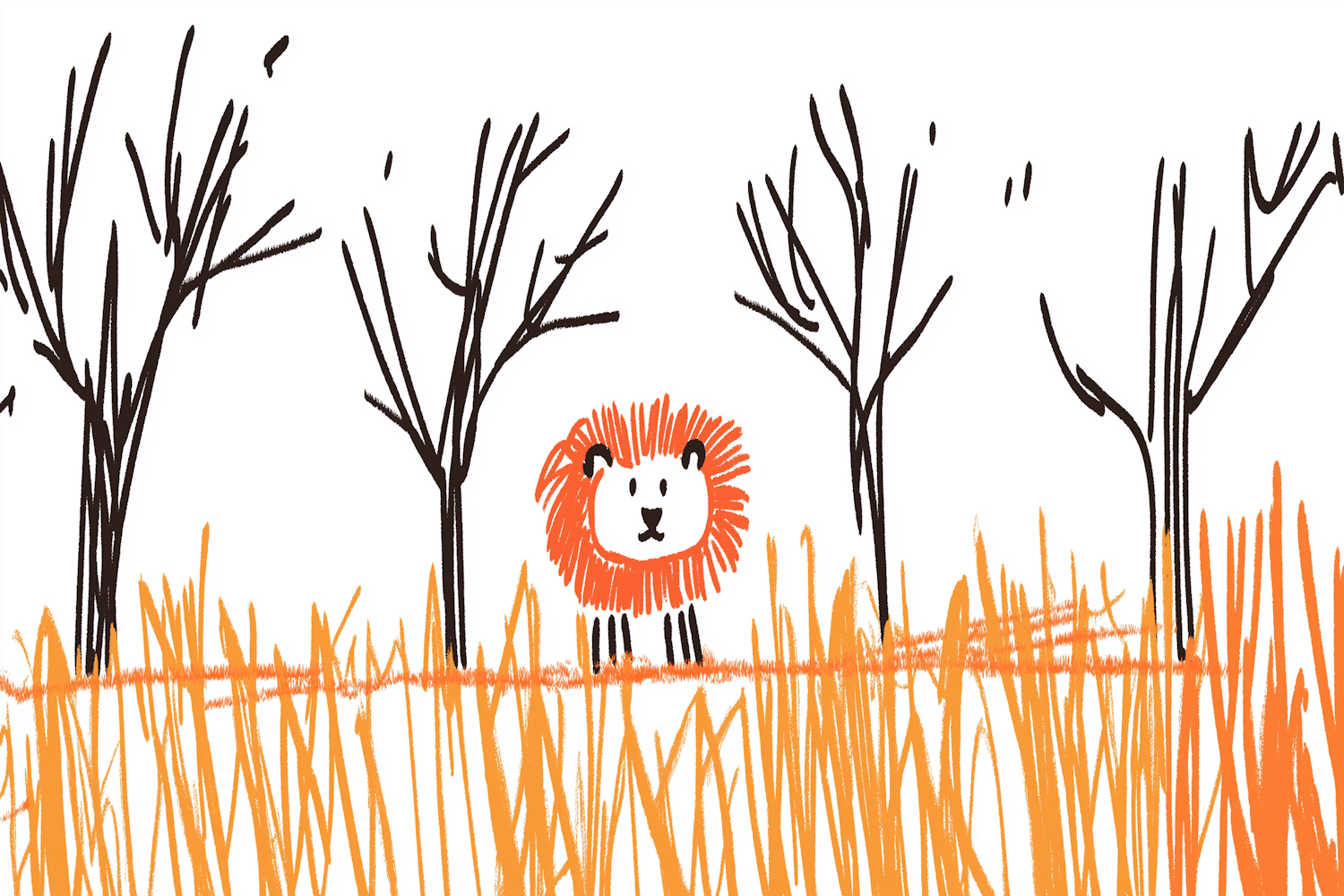 Whimsical illustration of a cartoon lion with an orange mane in tall grass, surrounded by bare trees on a white background.