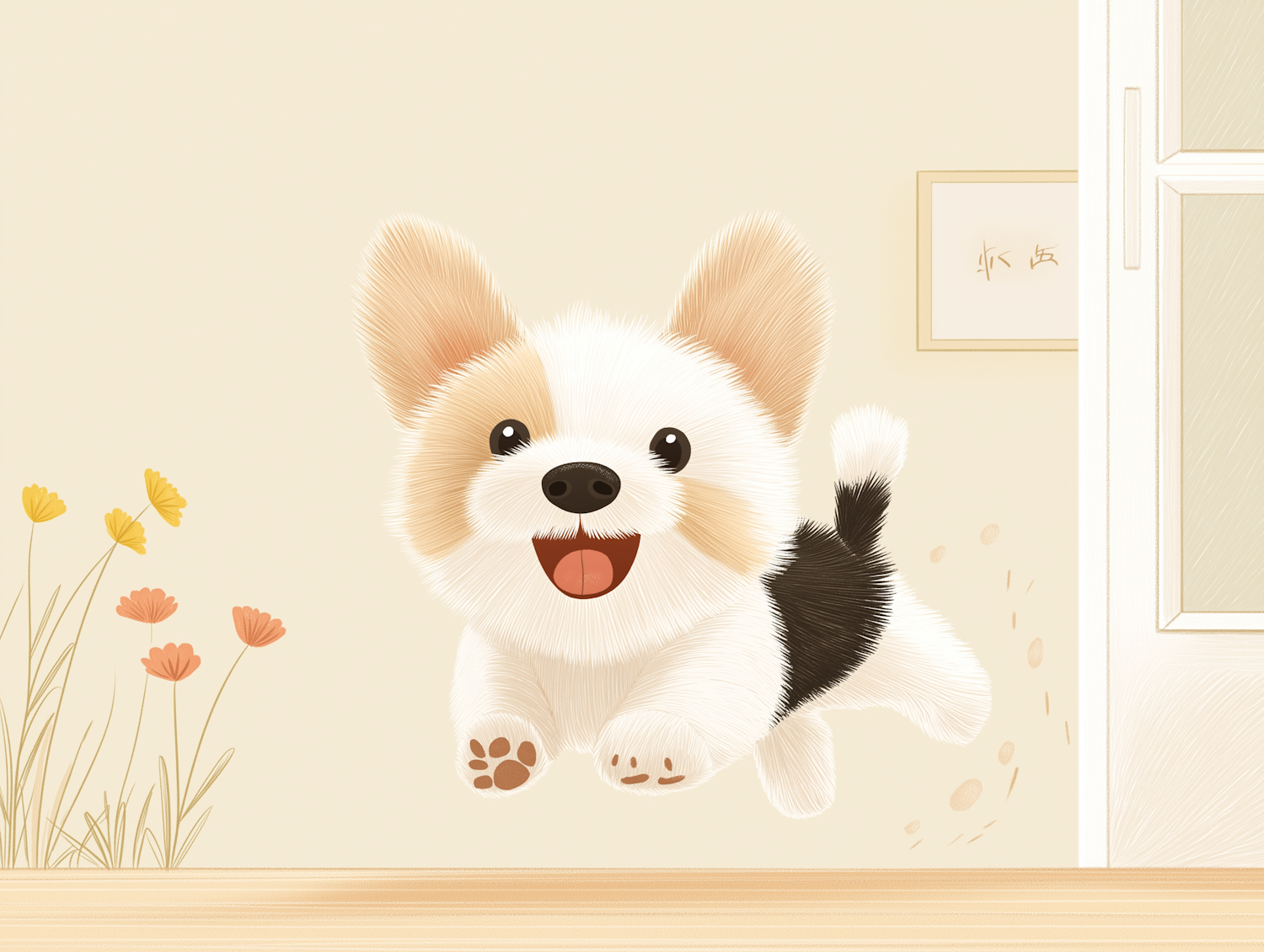 Cute illustration of a jumping puppy with perky ears in a cheerful room with bright tones and delicate flowers.