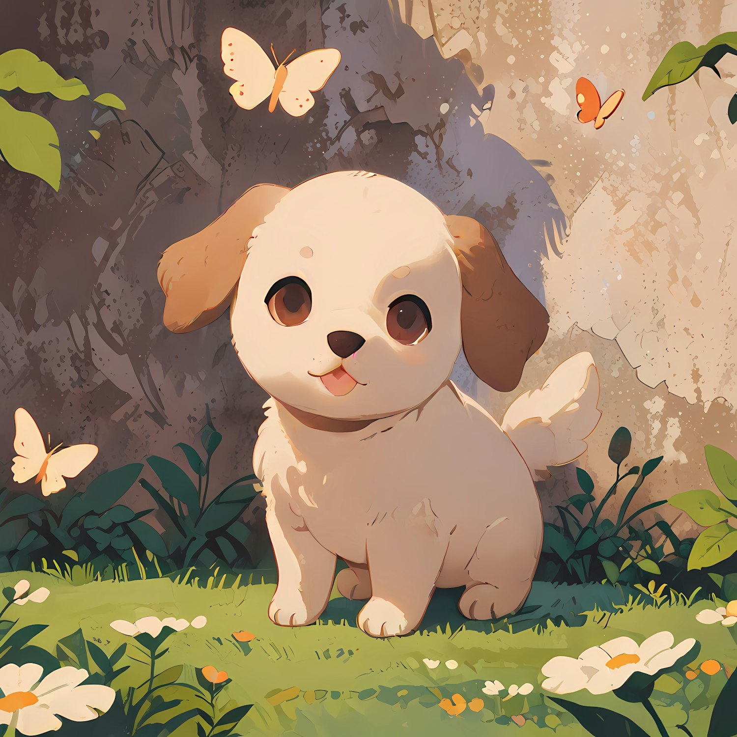 Adorable cartoon puppy with fluffy fur and butterflies in a vibrant garden setting, exuding charm and playfulness.