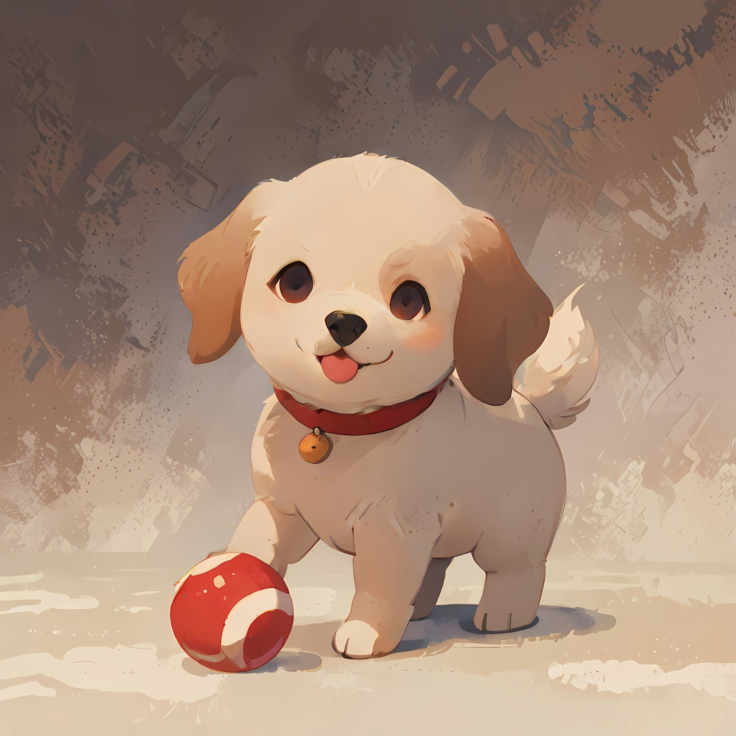 Adorable fluffy puppy with a red collar and bell, playfully posing with a red and white ball on a textured background.
