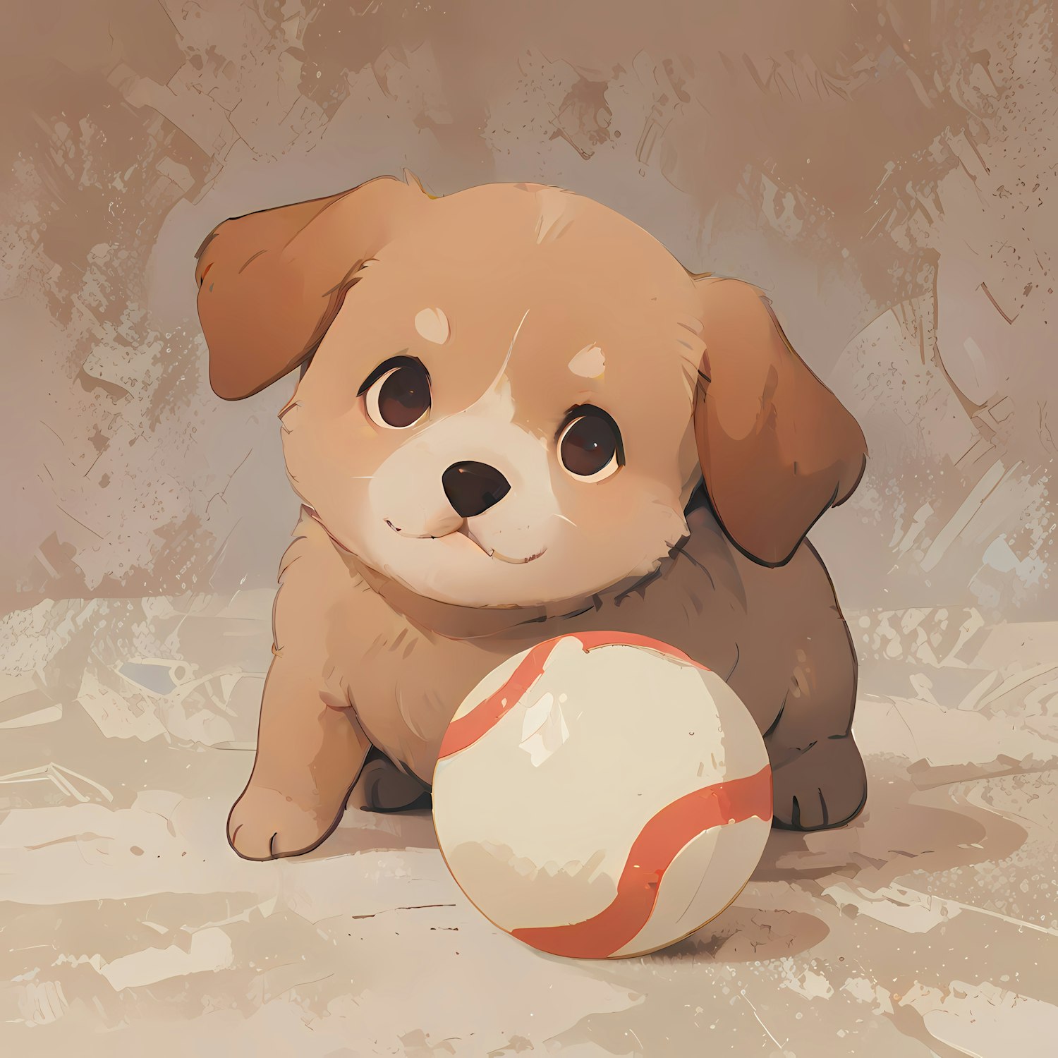 Adorable illustration of a fluffy brown puppy with a playful ball, set against a warm, textured background.