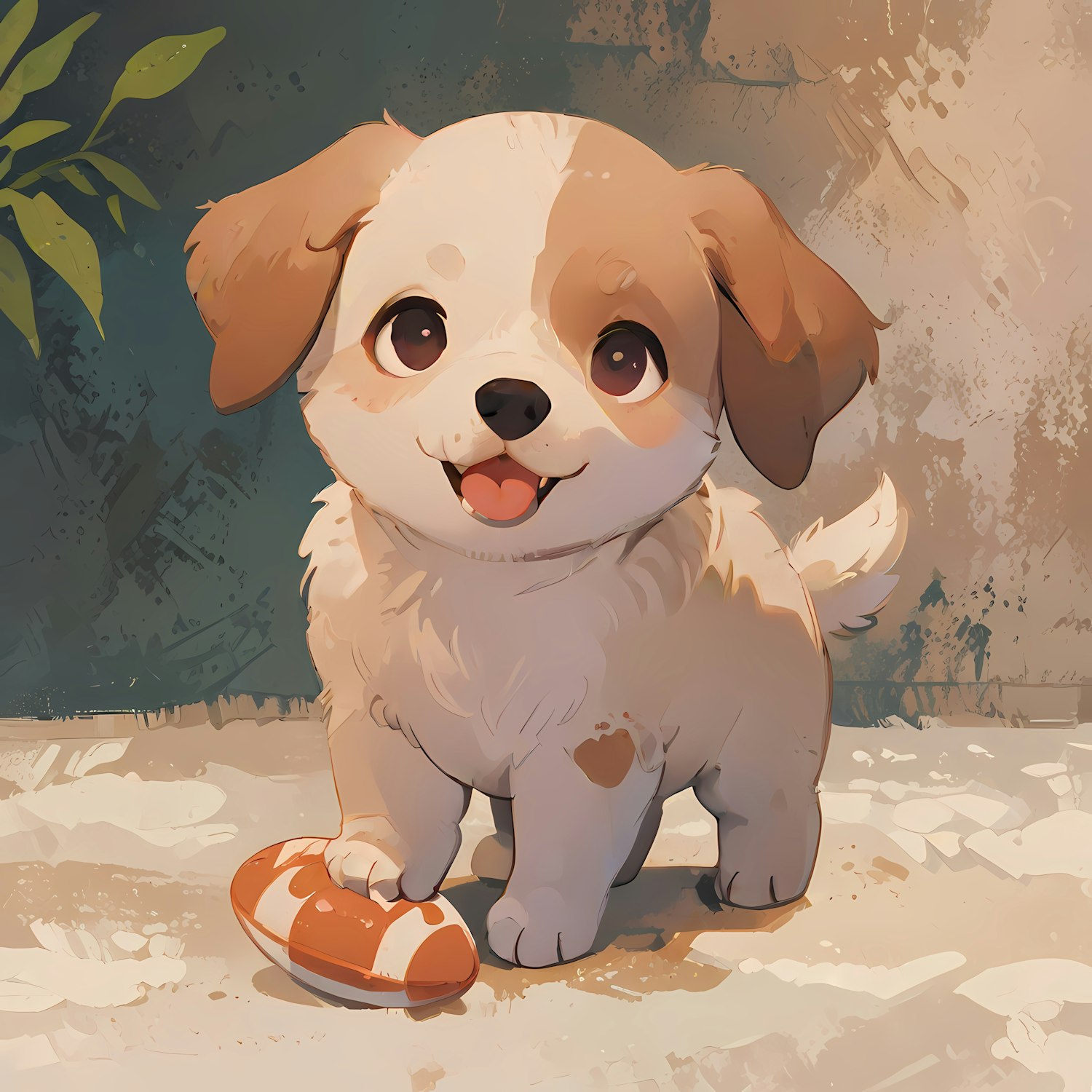 Adorable fluffy puppy with a toy, showcasing its playful and cute expression against a textured background.