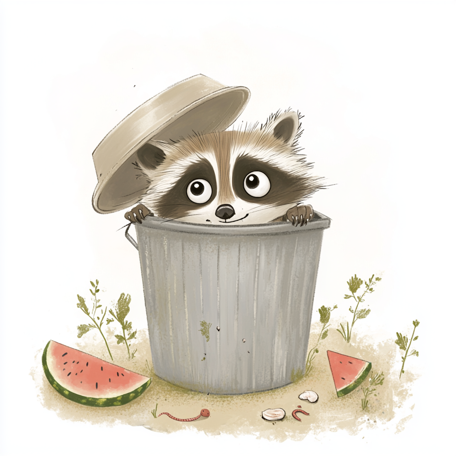 Adorable cartoon raccoon peeking from a trash can, surrounded by watermelon slices and greenery. Whimsical and playful illustration.