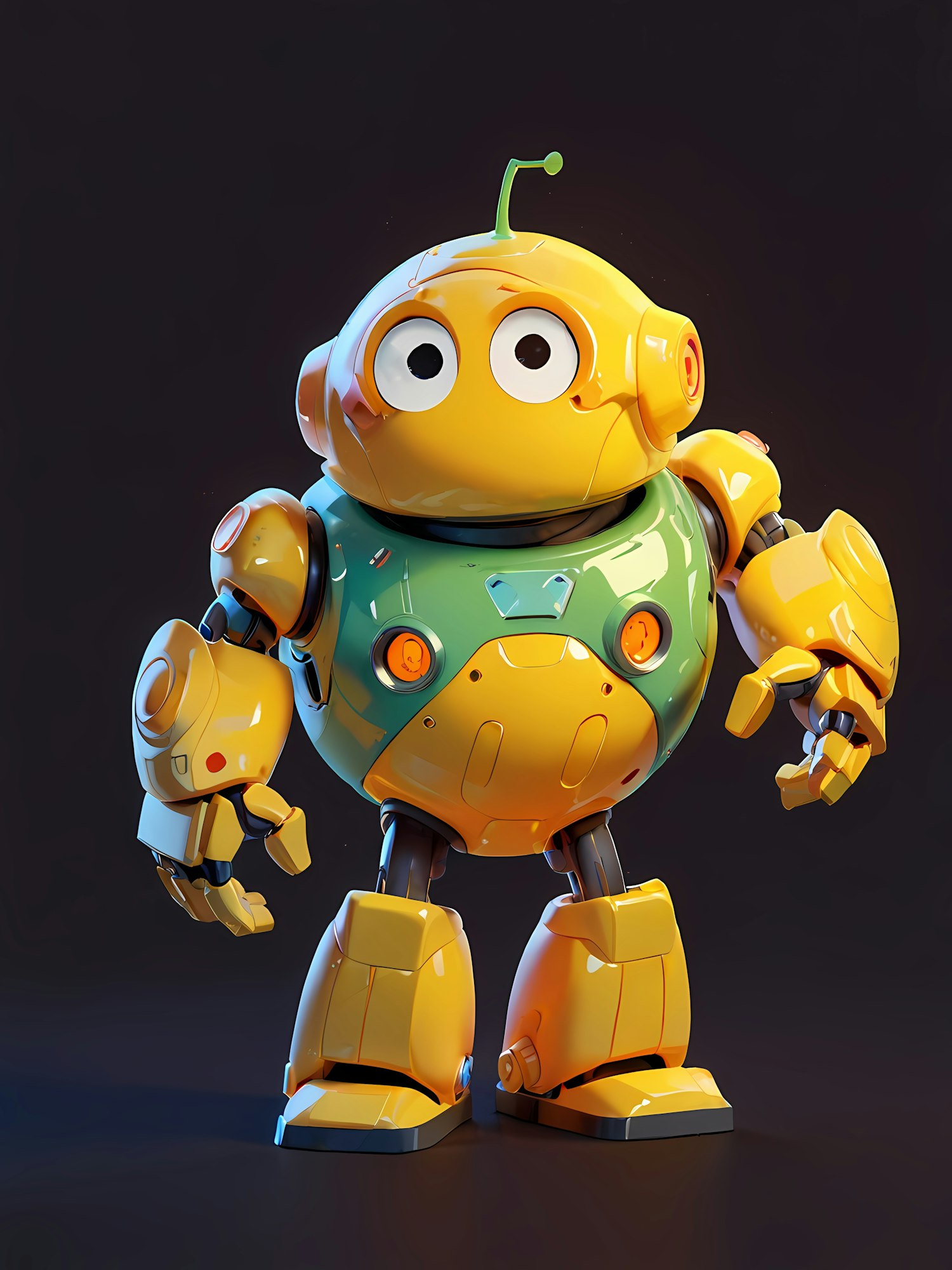 Bright yellow and green cartoon robot with big eyes and a playful design, standing against a dark background. Perfect for kids' themes.