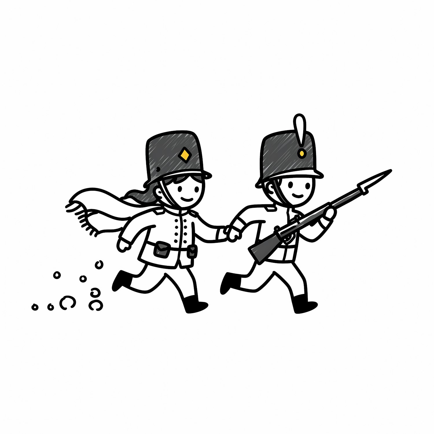 Two cartoon soldiers running hand in hand, one carrying a rifle, drawn in a simple black-and-white style with cheerful expressions.