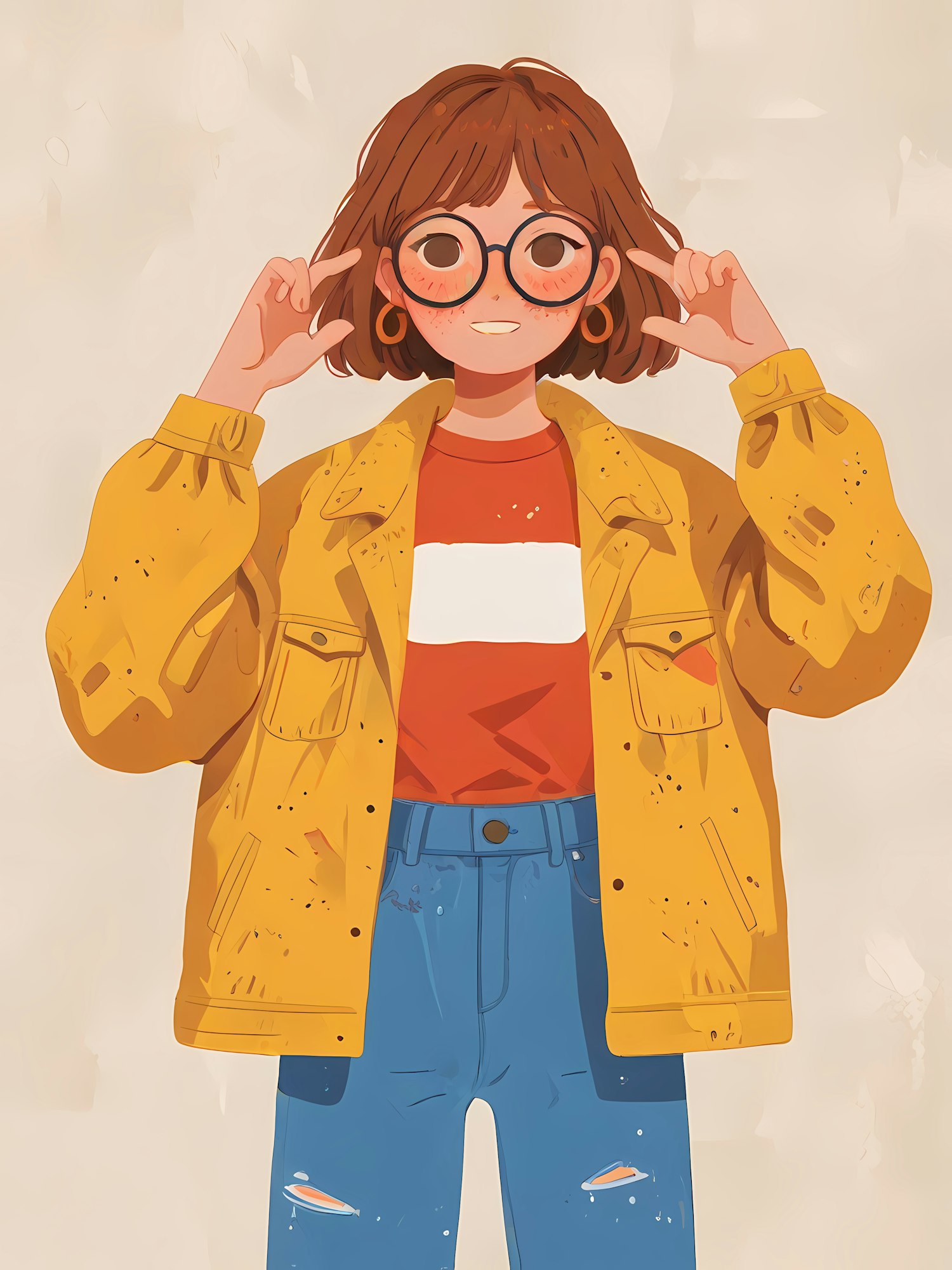 Cartoon illustration of a cheerful girl in a yellow jacket, red shirt, and blue jeans, playfully adjusting her round glasses.