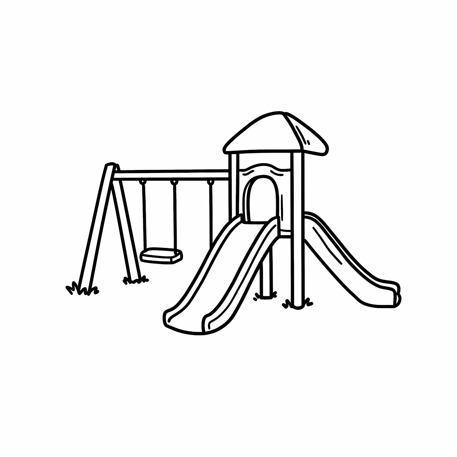 Line art of a playground with a slide, swings, and a roofed platform, surrounded by grass patches, in a clean black-and-white style.