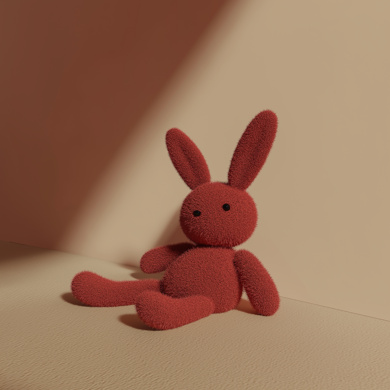 A plush red bunny toy with fuzzy texture sits against a beige background, casting a soft shadow. Warm lighting highlights its cute features.