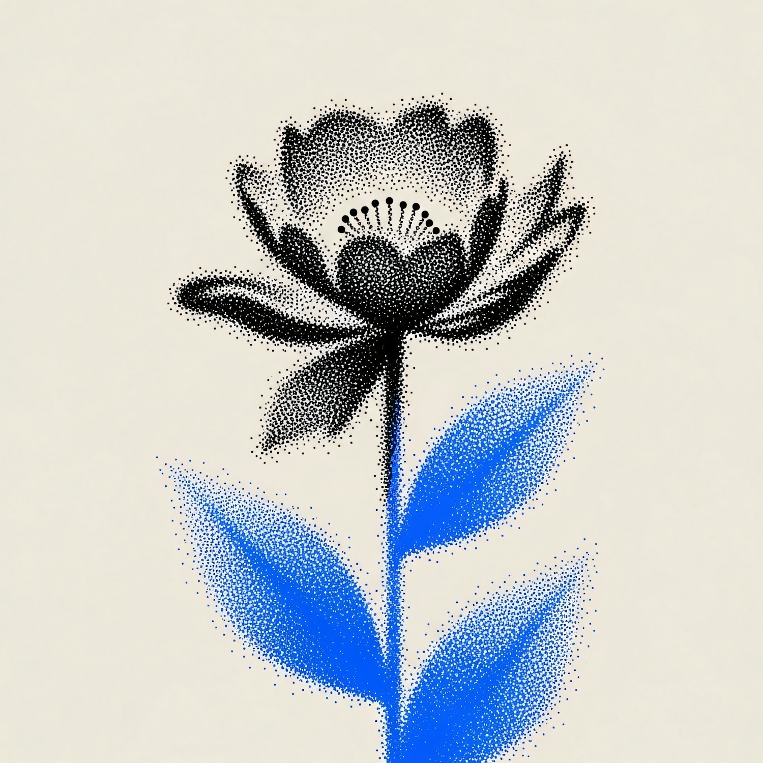 Stylized pointillism flower illustration with black petals and vibrant blue leaves on a beige background, showcasing artistic minimalism.