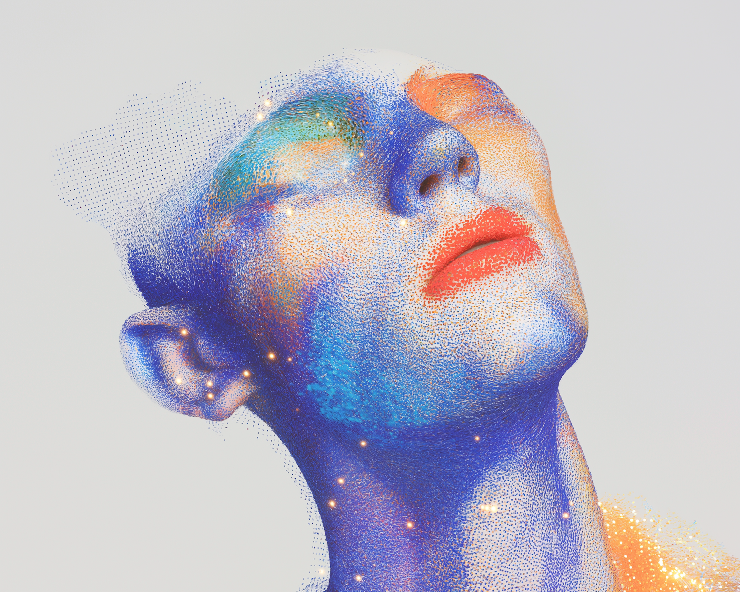 A vibrant pointillism-style artwork of a face with colorful gradients and glowing accents, creating a surreal and ethereal effect.