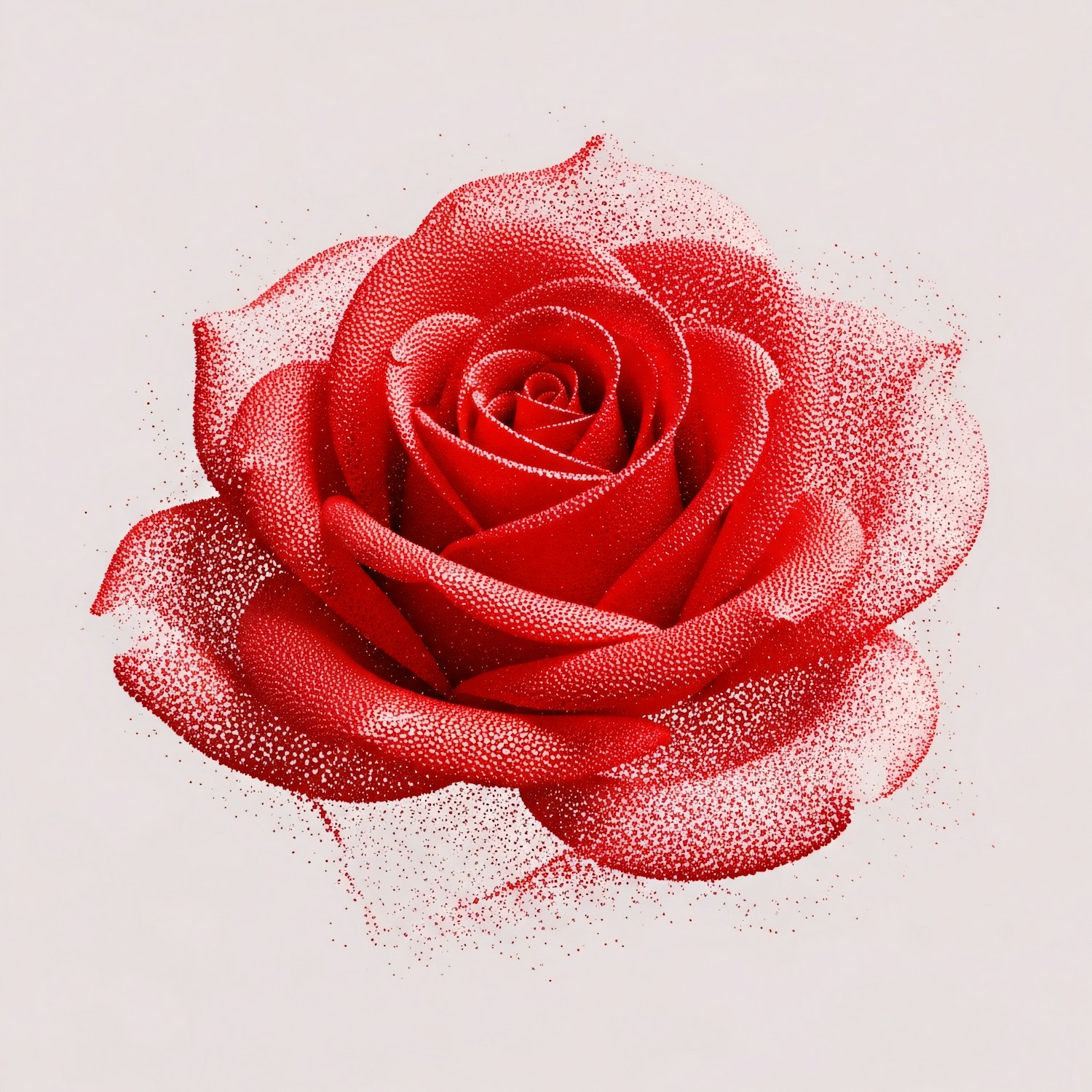 A stunning red rose rendered in a pointillism style, showcasing intricate dot patterns and vibrant colors against a white background.