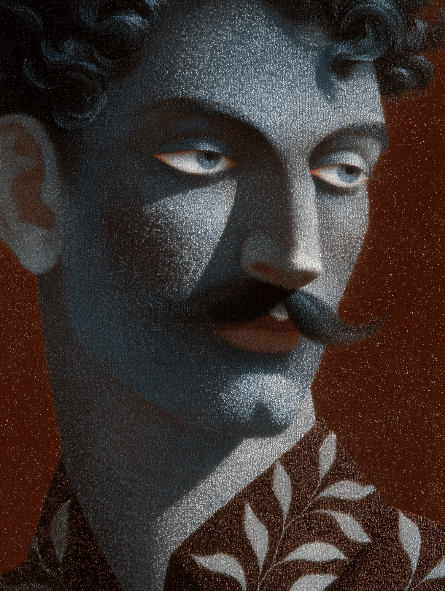 Stylized portrait of a man with a mustache and curly hair, featuring a textured design and a patterned outfit against a red background.