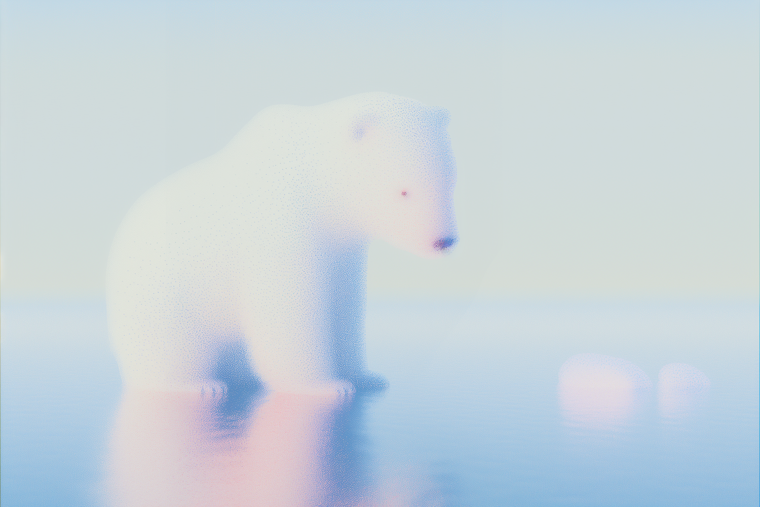 A tranquil polar bear on icy waters with soft pastel hues, reflecting serenity and solitude in an arctic setting.