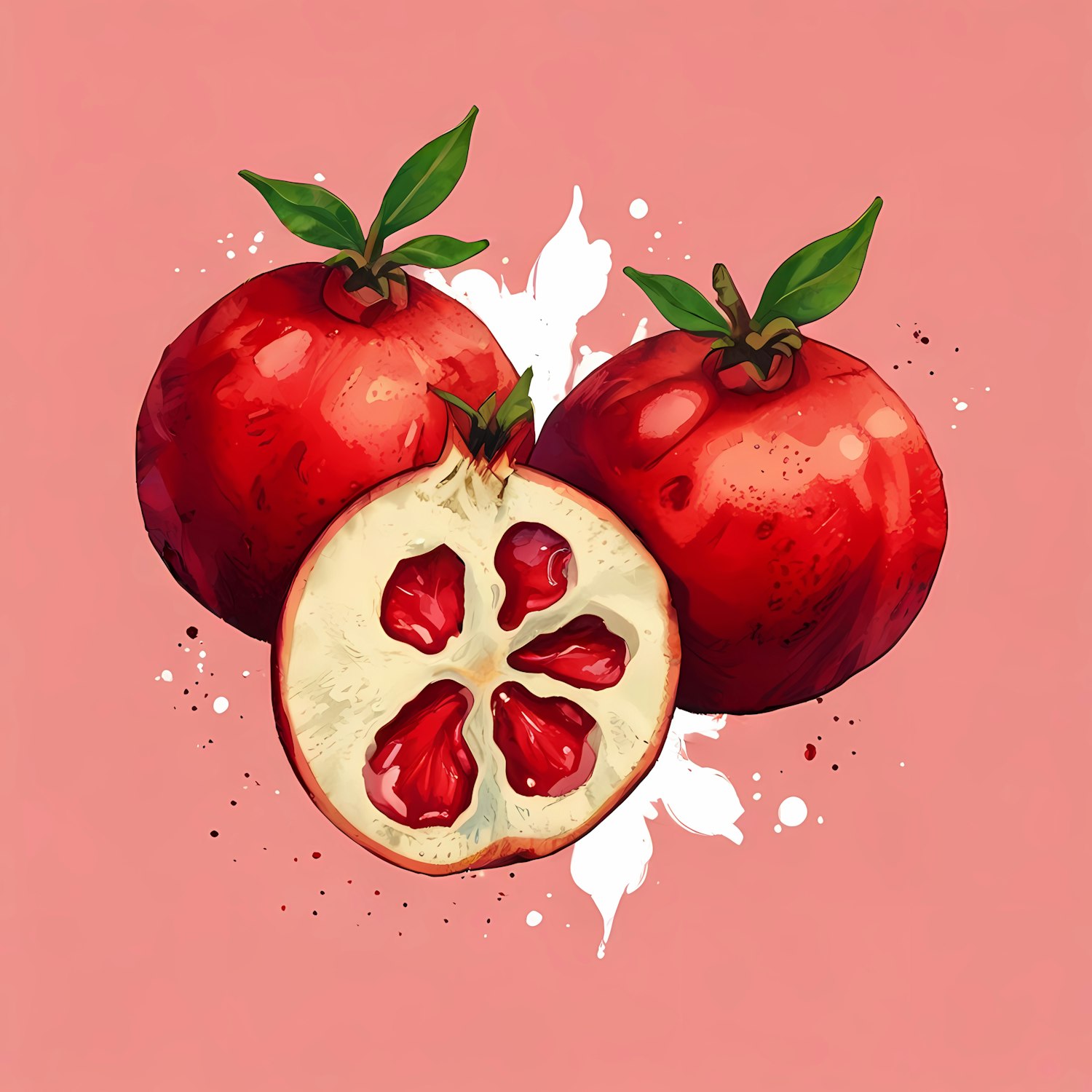 Vibrant illustration of whole and halved pomegranates with green leaves on a pink background, showcasing juicy red seeds.