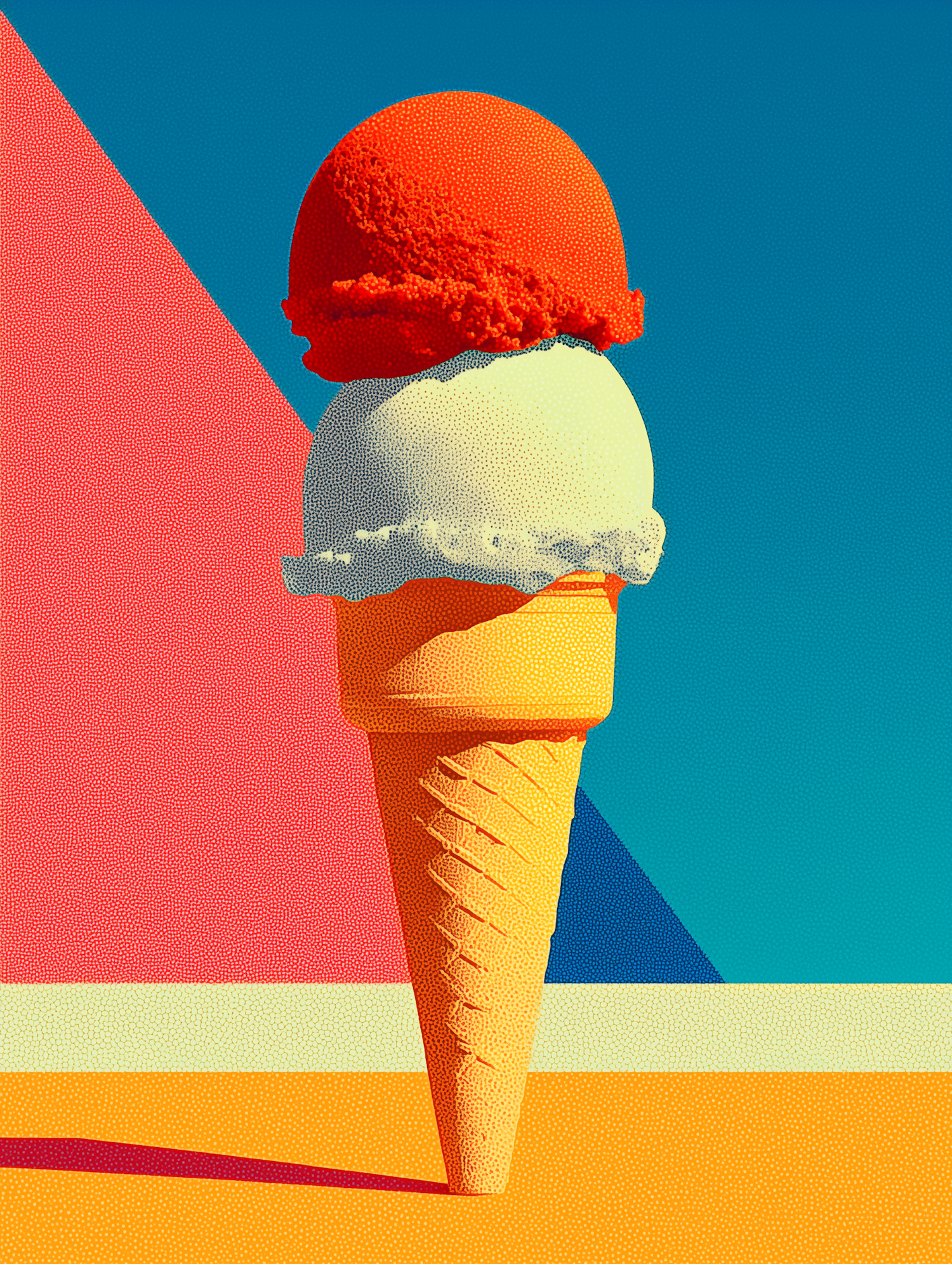 Bright pop-art style illustration of a two-scoop ice cream cone with bold colors and geometric background shapes.