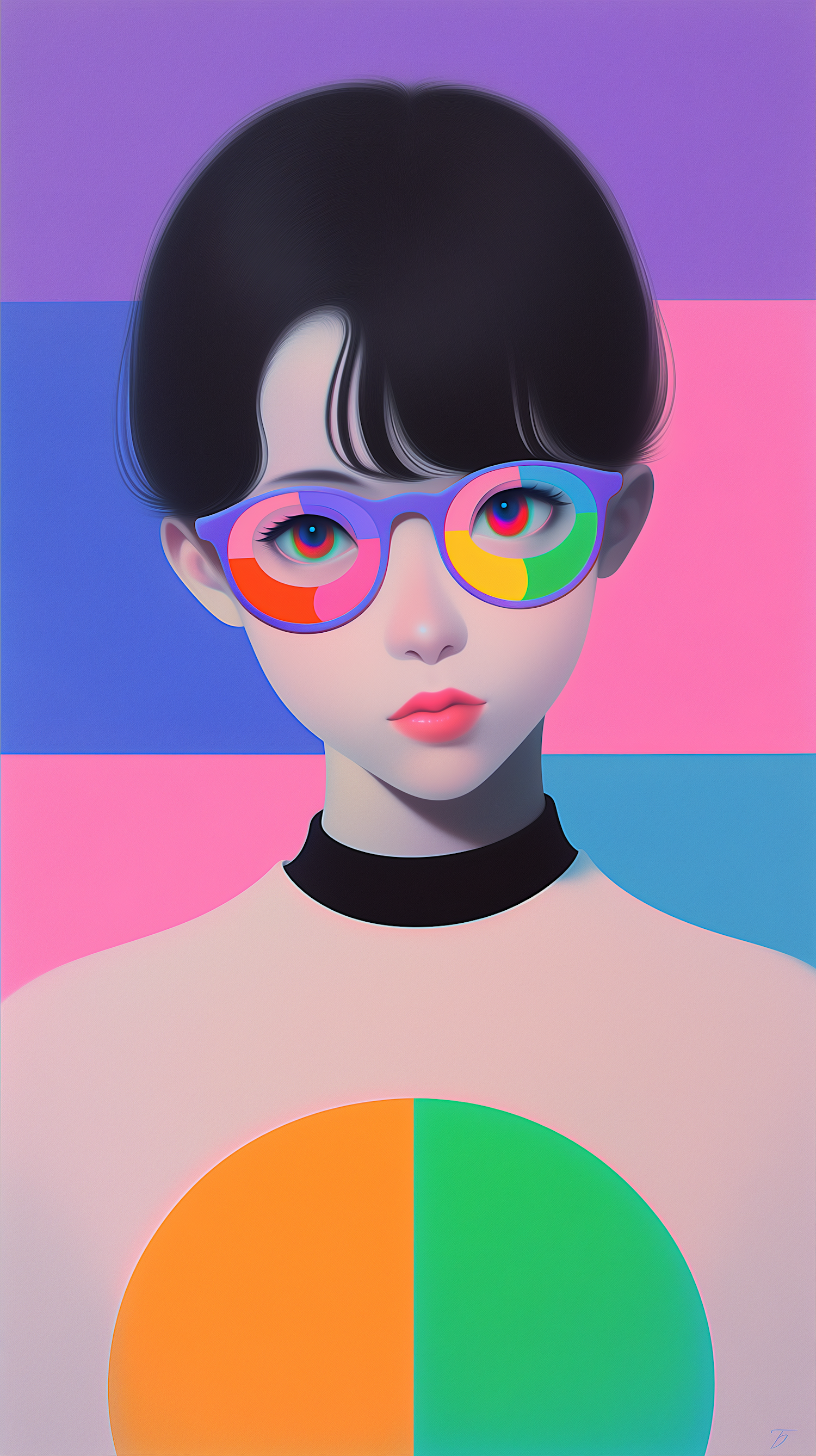 A vibrant digital illustration of a person with colorful glasses and a bold geometric background, showcasing a modern pop-art style.