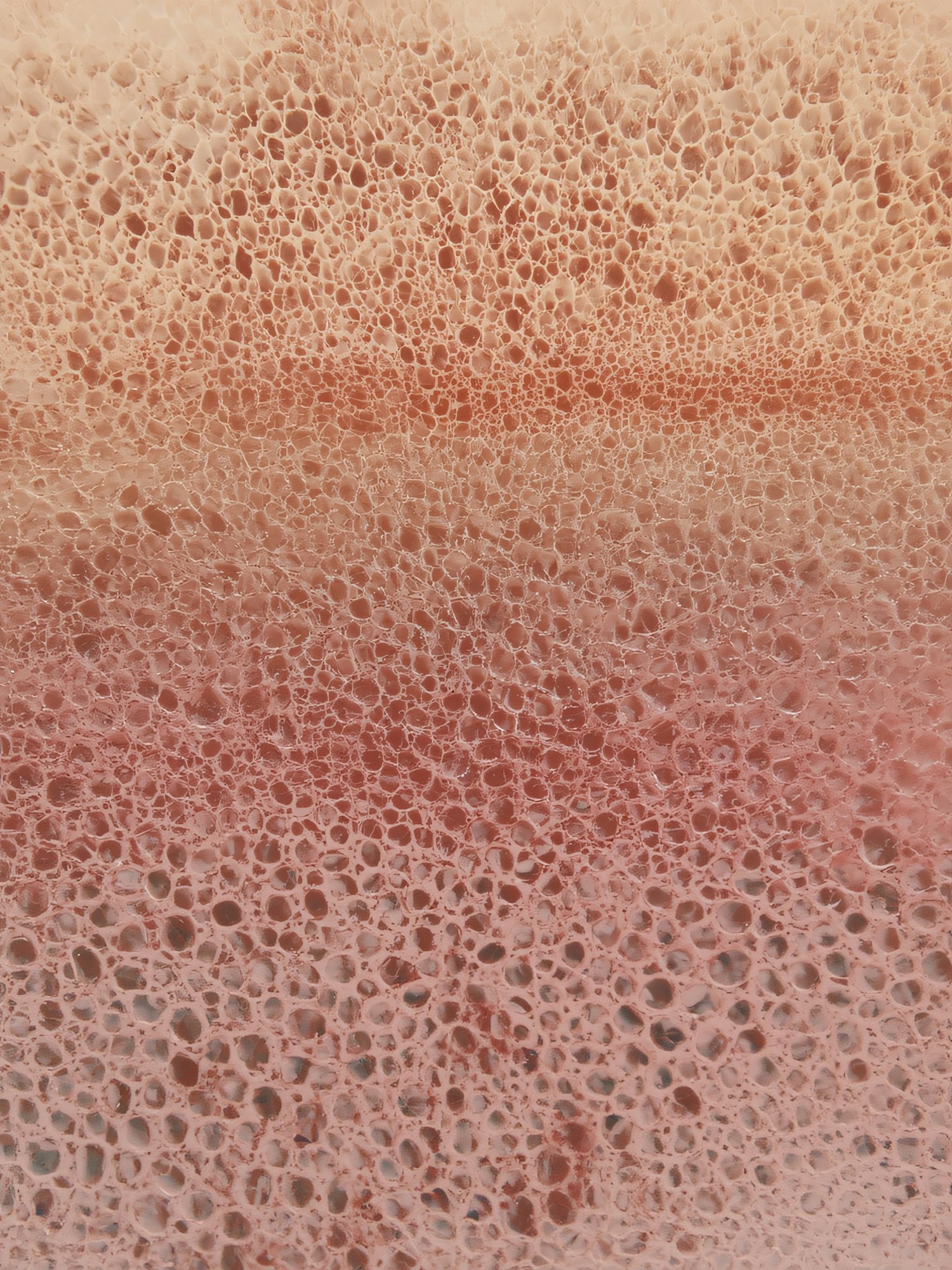 Close-up of a textured, porous surface with a gradient from beige to red tones, showcasing intricate patterns and depth.