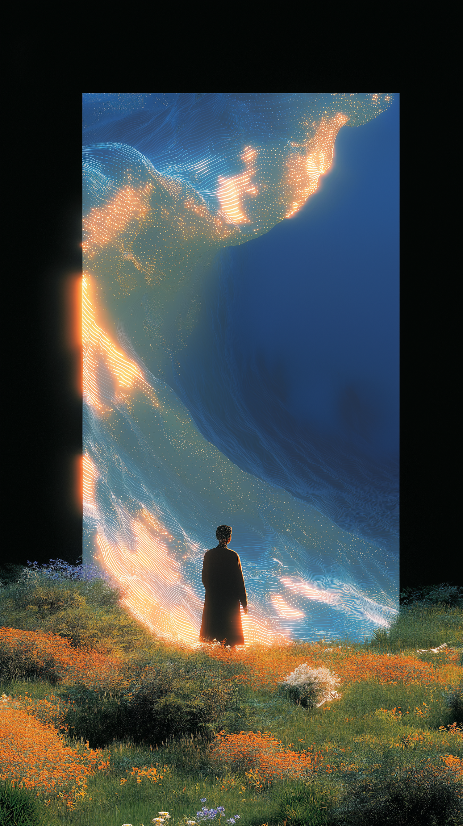 A person stands in a vibrant meadow, facing a glowing portal of swirling blue and golden light, creating a surreal and captivating scene.