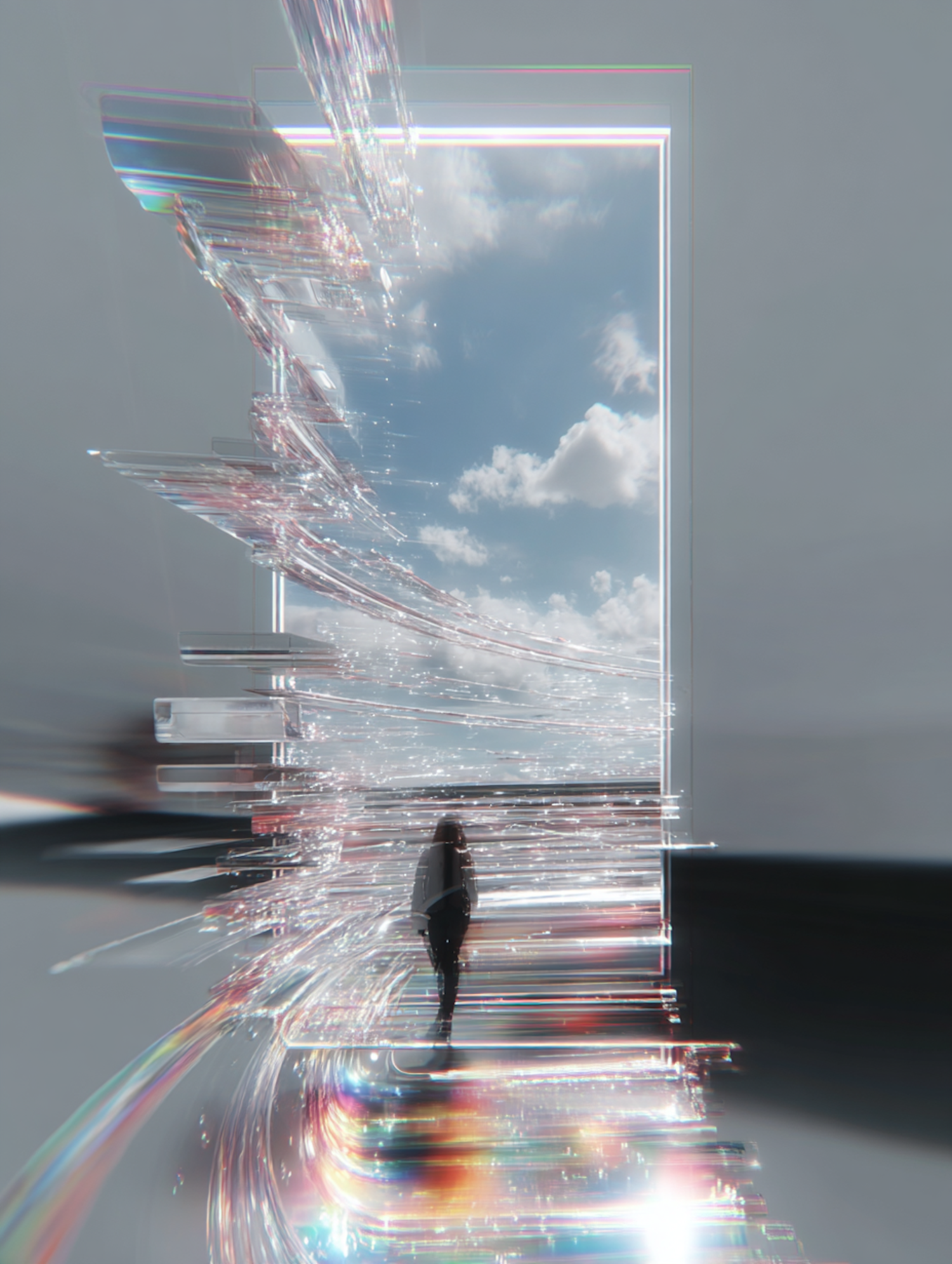 A person stands before a glowing portal emitting refracted light and glass-like structures, opening to a bright, cloud-filled sky.