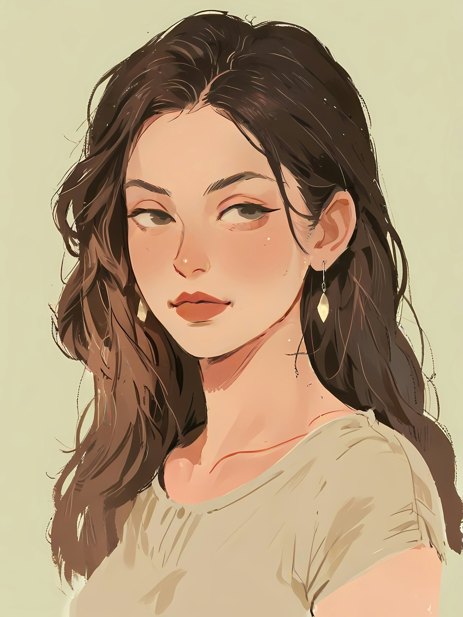 Stylishly illustrated portrait of a young woman with long wavy hair, a relaxed gaze, and a minimalist pastel background. Elegant and serene.