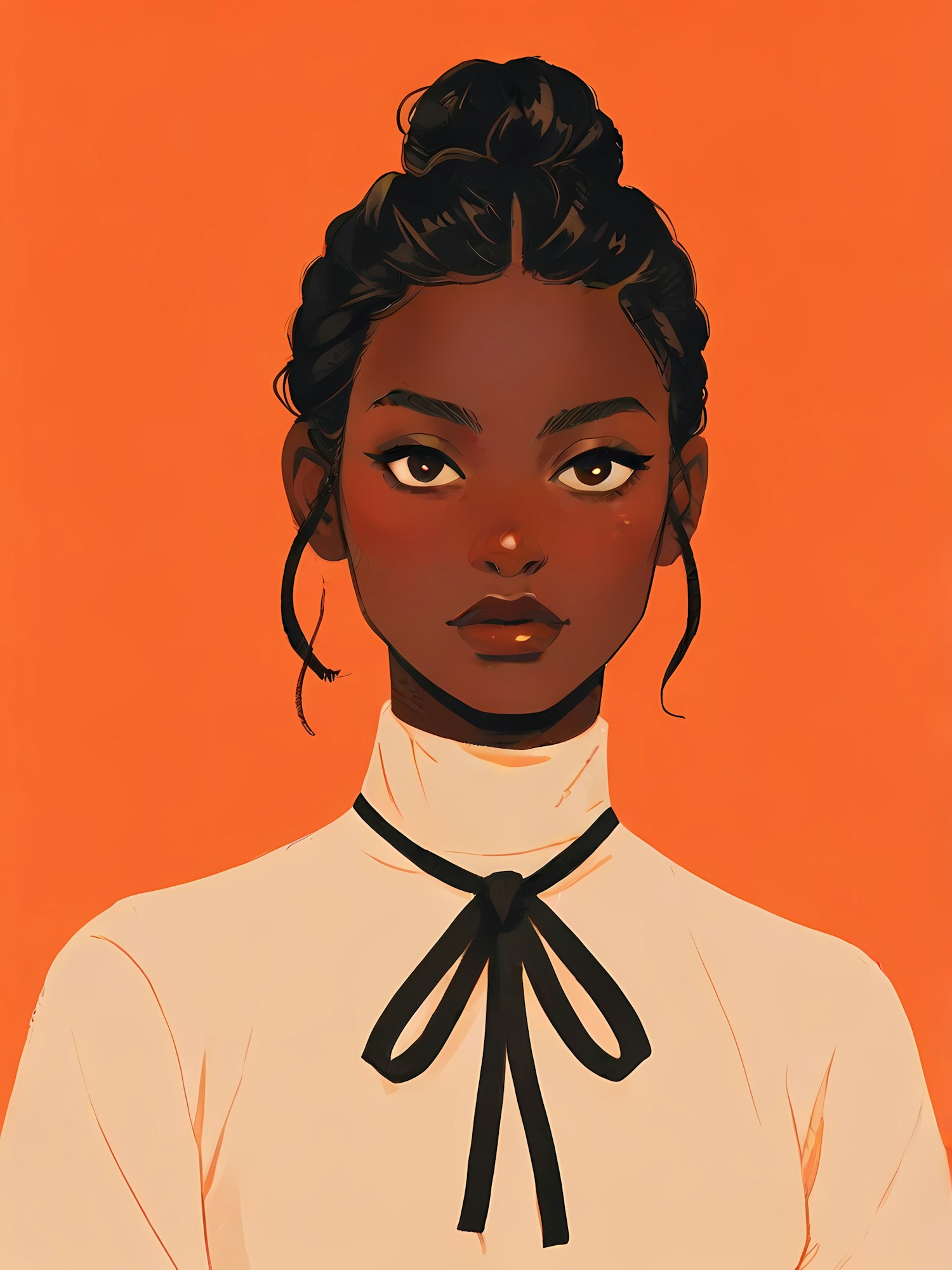 Digital illustration of a young Black woman with a bun, wearing a cream top with a black bow, set against a vibrant orange background.