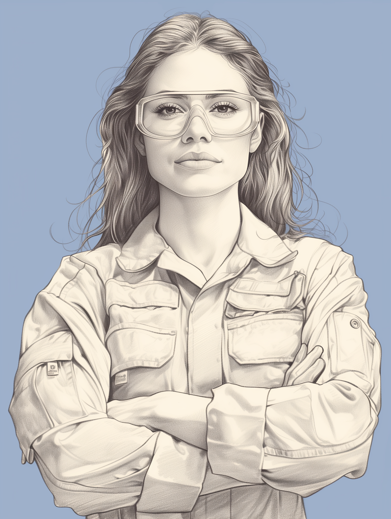 Illustration of a confident woman in protective goggles and utility shirt, set against a light blue background.